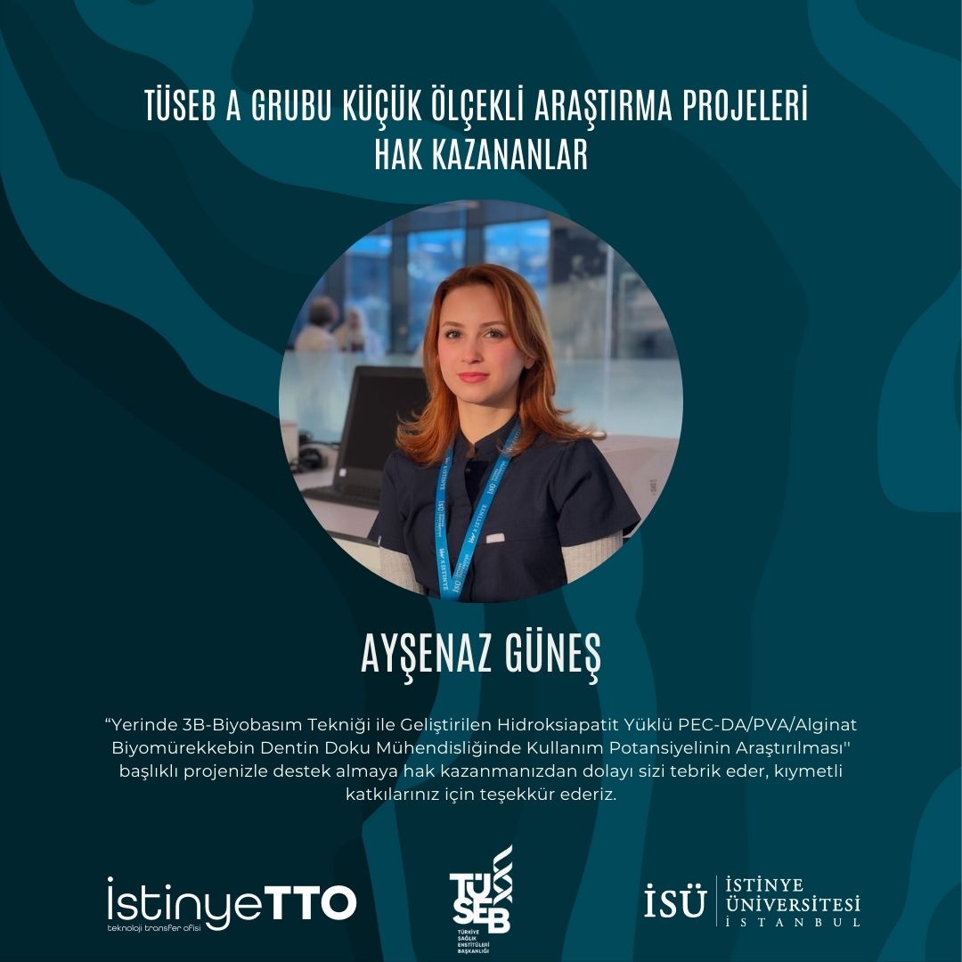 🔹 Ayşenaz Güneş – “Yerinde 3B-Biyobasım Tekniği ile Geliştirilen Hidroksiapatit Yüklü PEC-DA/PVA/Alginat Biyomürekkebin Dentin Doku Mühendisliğinde Kullanım Potansiyelinin Araştırılması”