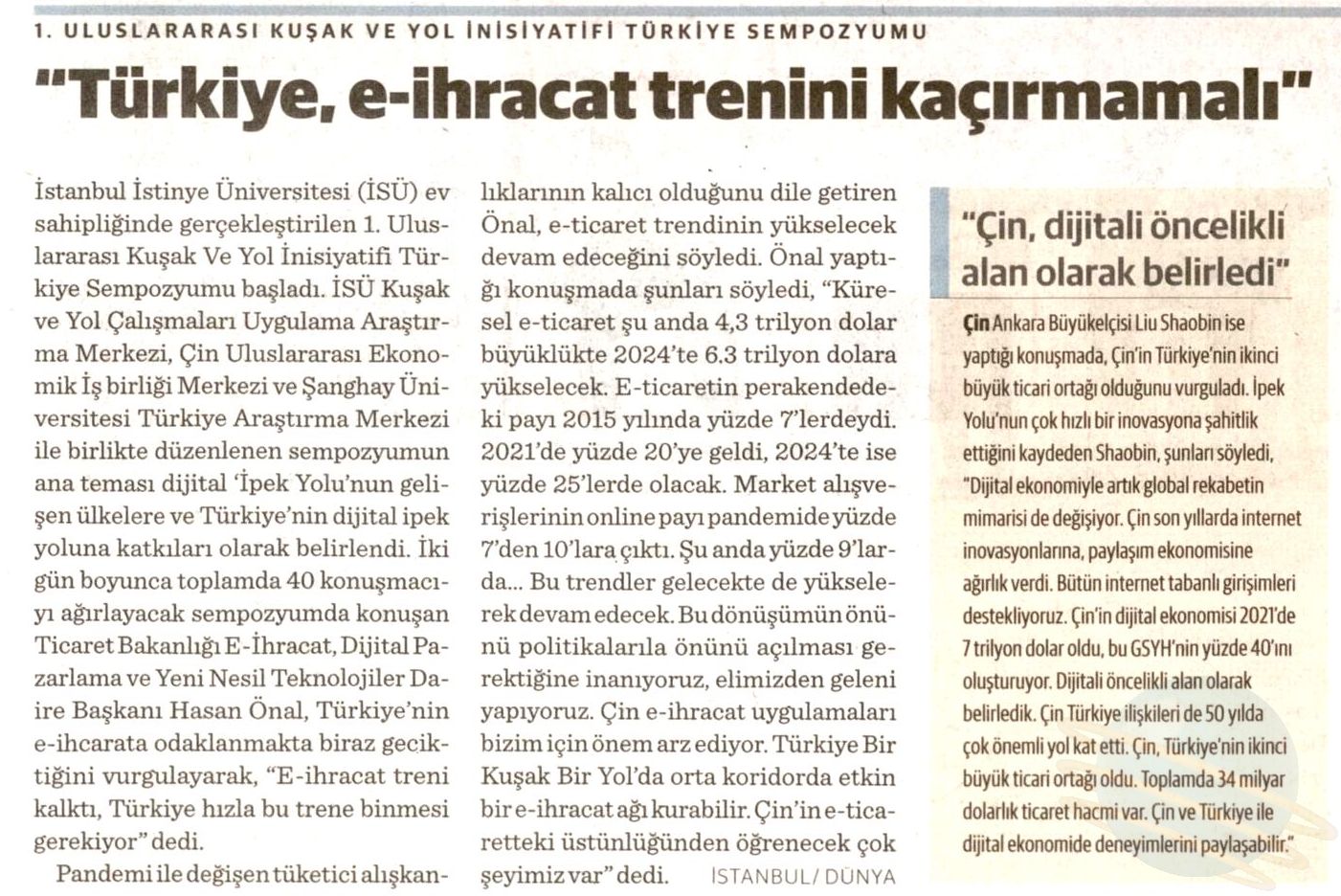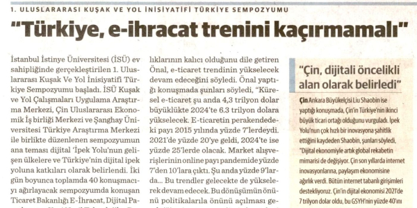 İstanbul İstinye Üniversitesi (İSÜ) ev sahipliğinde gerçekleştirilen 1. Uluslararası Kuşak Ve Yol İnisiyatifi Türkiye Sempozyumu başladı. İSÜ Kuşak ve Yol Çalışmaları Uygulama Araştırma Merkezi, Çin Uluslararası Ekonomik İş birliği Merkezi ve Şanghay Üniversitesi Türkiye Araştırma Merkezi ile birlikte düzenlenen sempozyumun ana teması dijital 'İpek Yolu'nun gelişen ülkelere ve Türkiye'nin dijital ipek yoluna katkıları olarak belirlendi. İki gün boyunca toplamda 40 konuşmacıyı ağırlayacak sempozyumda konuşan Ticaret Bakanlığı E-İhracat, Dijital Pazarlama ve Yeni Nesil Teknolojiler Daire Başkanı Haşan Önal, Türkiye'nin e-ihracata odaklanmakta biraz geciktiğini vurgulayarak, "E-ihracat treni kalktı, Türkiye hızla bu trene binmesi gerekiyor" dedi.