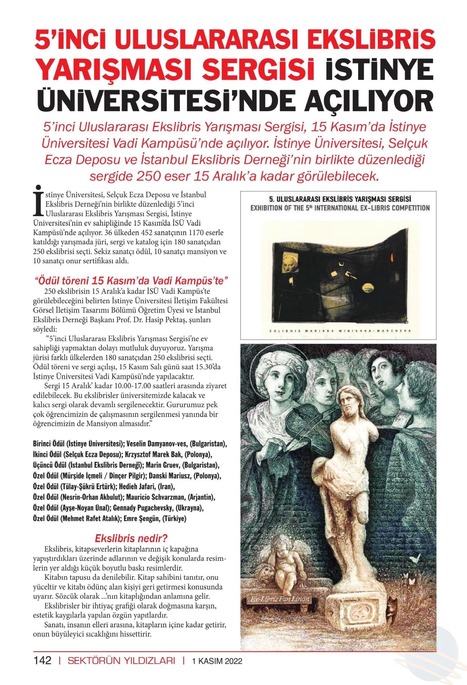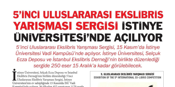 "5'inci Uluslararası Ekslibris Yarışması Sergisine ev sahipliği yapmaktan dolayı mutluluk duyuyoruz. Yarışma jürisi farklı ülkelerden 180 sanatçıdan 250 ekslibrisi seçti. Ödül töreni ve sergi açılışı, 15 Kasım Sah günü saat 15.30'da İstinye Üniversitesi Vadi Kampüsü'nde yapılacaktır. Sergi 15 Aralık' kadar 10.00-17.00 saatleri arasında ziyaret edilebilecek. Bu ekslibrisler üniversitemizde kalacak ve kalıcı sergi olarak devamlı sergilenecektir. Gururumuz pek çok öğrencimizin de çalışmasının sergilenmesi yanında bir öğrencimizin de Mansiyon almasıdır."