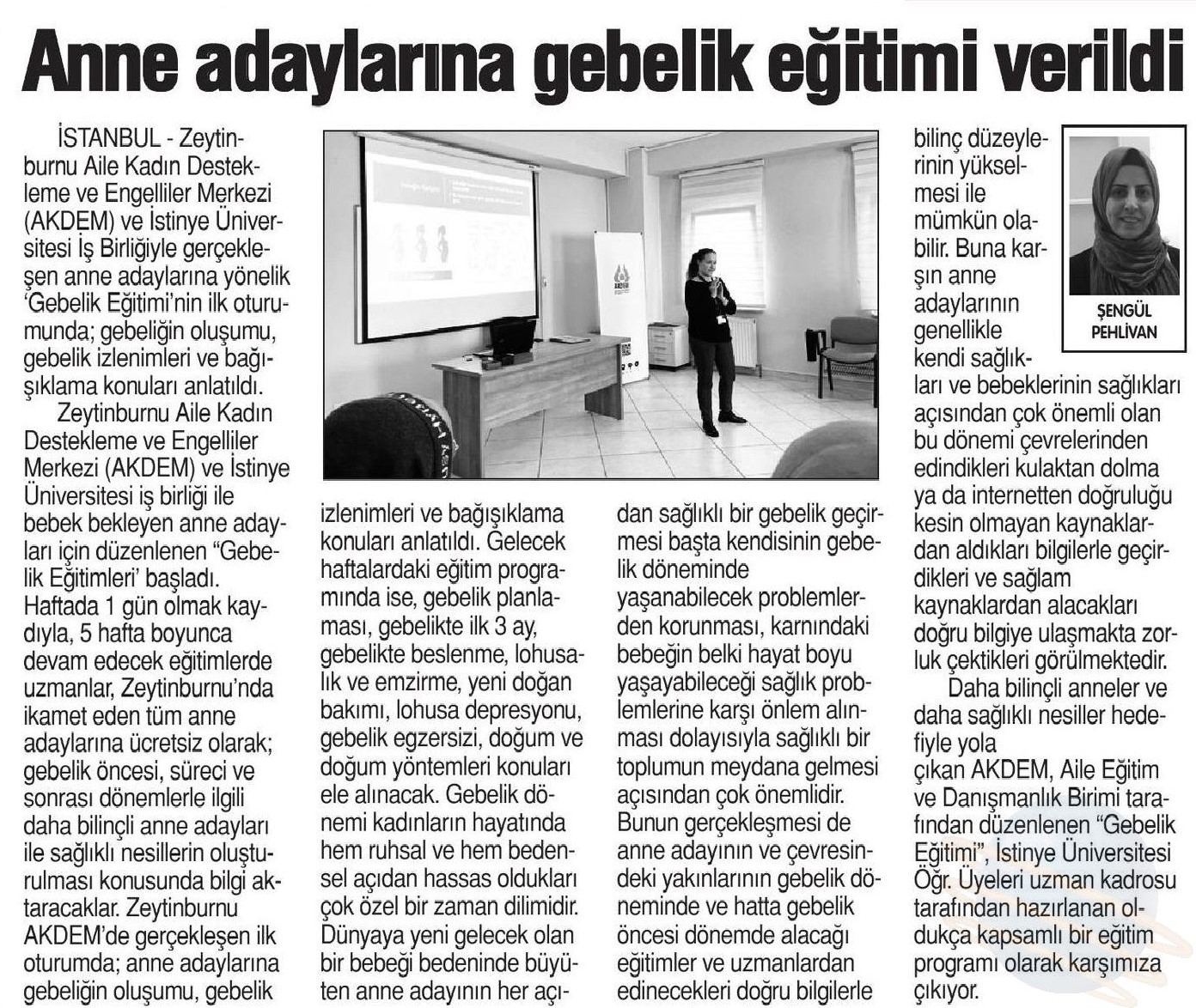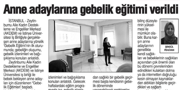 İstanbul Zeytinburnu Aile Kadın Destekleme ve Engelliler Merkezi (AKDEM) ve İstinye Üniversitesi İş Birliğiyle gerçekleşen anne adaylarına yönelik 'Gebelik Eğitimi'nin ilk oturumunda; gebeliğin oluşumu, gebelik izlenimleri ve bağışıklama konuları anlatıldı.
