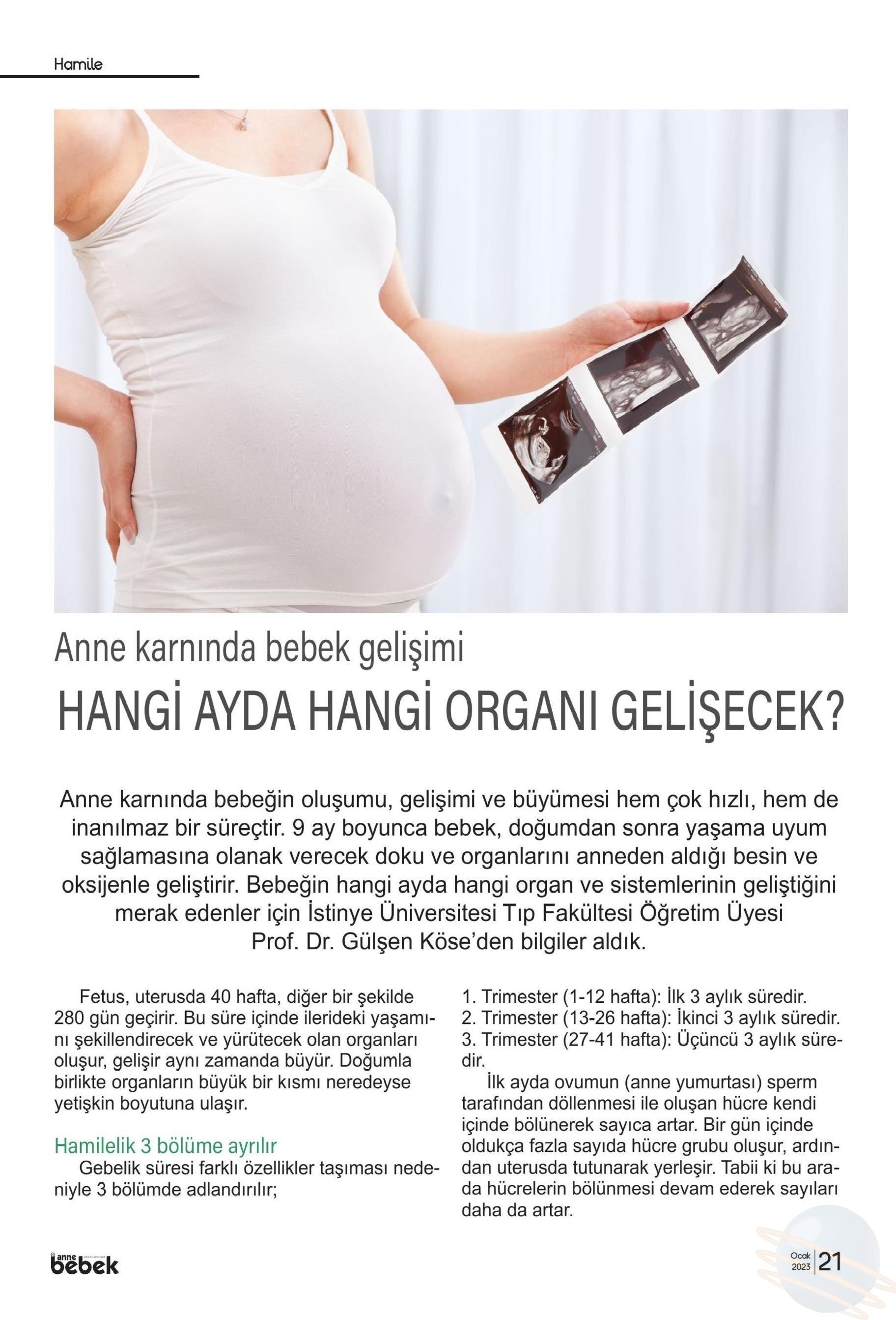 Anne karnında bebeğin oluşumu, gelişimi ve büyümesi hem çok hızlı, hem de inanılmaz bir süreçtir. 9 ay boyunca bebek, doğumdan sonra yaşama uyum sağlamasına olanak verecek doku ve organlarını anneden aldığı besin ve oksijenle geliştirir. Bebeğin hangi ayda hangi organ ve sistemlerinin geliştiğini merak edenler için İstinye Üniversitesi Tıp Fakültesi Öğretim Üyesi Prof. Dr. Gülşen Köse'den bilgiler aldık.