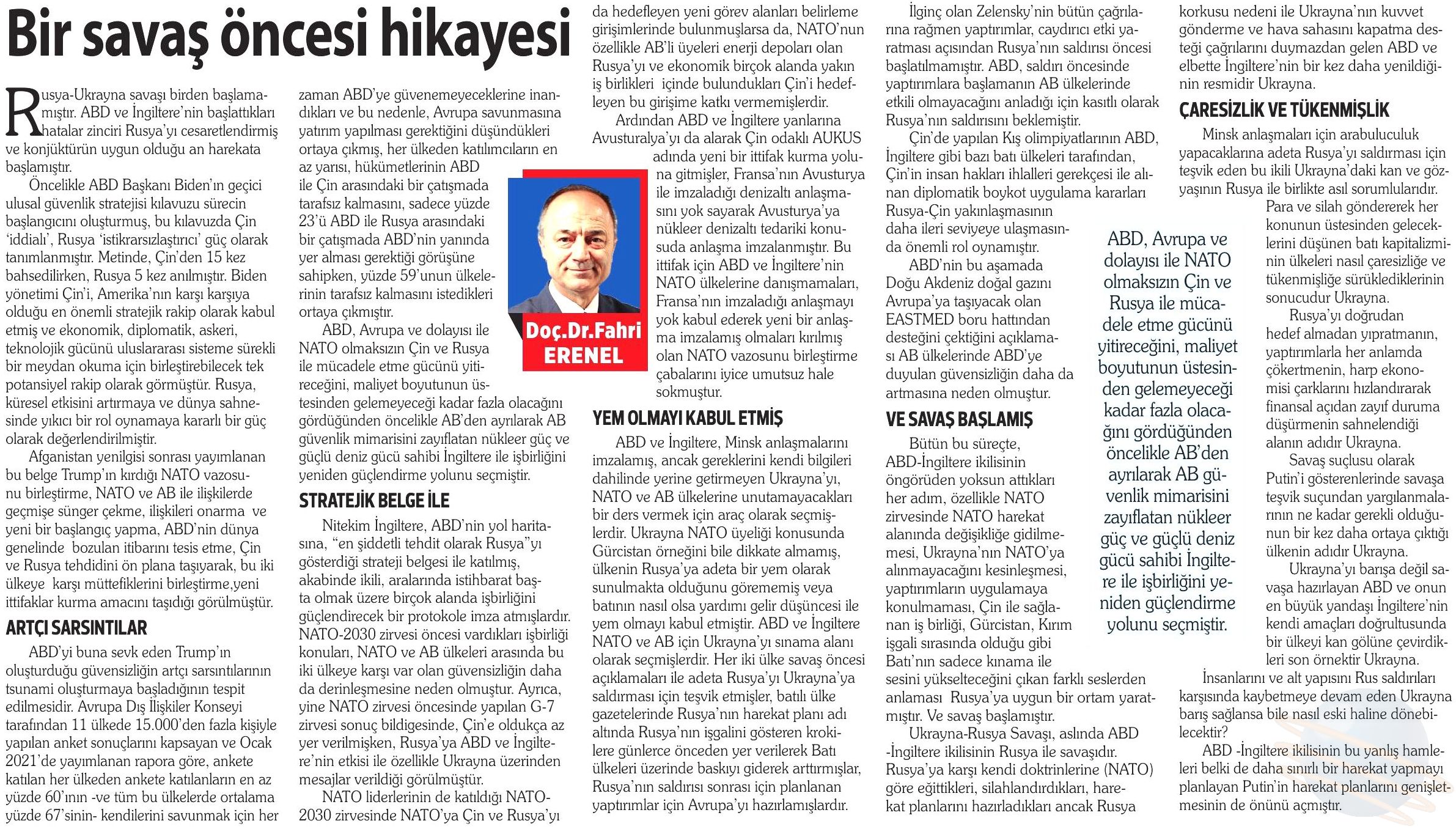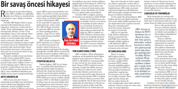 Bütün bu süreçte, ABD-İngiltere İkilisinin öngörüden yoksun attıkları her adım, özellikle NATO zirvesinde NATO harekat alanında değişikliğe gidilmemesi. Ukrayna'nın NATO'ya alınmayacağını kesinleşmesi, yaptırımların uygulamaya konulmaması. Çin ile sağlanan iş birliği, Gürcistan. Kırım işgali sırasında olduğu gibi Batı'nın sadece kınama ile sesini yükselteceğini çıkan farklı seslerden anlaması Rusya'ya uygun bir ortam yaratmıştır. Ve savaş başlamıştır. Ukrayna-Rusya Savaşı, aslında ABD -İngiltere İkilisinin Rusya ile savaşıdır. Rusya'ya karşı kendi doktrinlerine (NATO) göre eğittikleri, silahlandırdıkları, harekat planlarını hazırladıkları ancak Rusya korkusu nedeni ile Ukrayna'nın kuvvet gönderme ve hava sahasını kapatma desteği çağrılarını duymazdan gelen ABD ve elbette İngiltere'nin bir kez daha yenildiğinin resmidir Ukrayna.