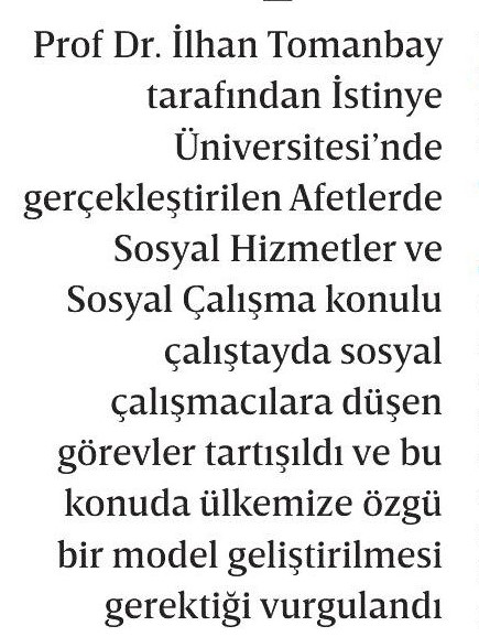 İstinye Üniversitesi'nde düzenlenen çalıştayın düzenleyicisi Prof. Dr. İlhan Tomanbay bu çalışmayı iki temel gerekçeyle düzenlediklerini söylüyor: "Birincisi Türkiye bir deprem ülkesi ve ülkedeki sosyal çalışma deprem olgusundan çok uzak. İkincisi sosyal çalışma denilmesi gereken alan Türkiye'de yalnızca sosyal hizmetten ibaret zannediliyor. Sosyal yardım dağıtımından başka bir şey yapılmaz diye bakılıyor.