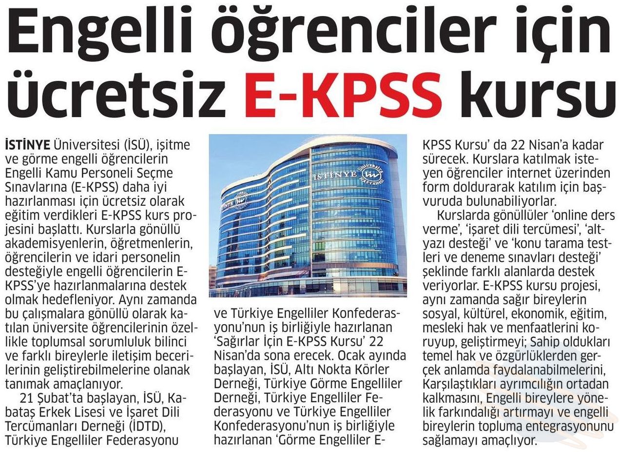 21 Şubat'ta başlayan, İSÜ, Kabataş Erkek Lisesi ve İşaret Dili Tercümanları Derneği (İDTD), Türkiye Engelliler Federasyonu ve Türkiye Engelliler Konfederasyonumun iş birliğiyle hazırlanan 'Sağırlar İçin E-KPSS Kursu' 22 Nisan'da sona erecek. Ocak ayında başlayan, İSÜ, Altı Nokta Körler Derneği, Türkiye Görme Engelliler Derneği, Türkiye Engelliler Federasyonu ve Türkiye Engelliler Konfederasyonumun iş birliğiyle hazırlanan 'Görme Engelliler EKPSS Kursu' da 22 Nisan'a kadar sürecek. Kurslara katılmak isteyen öğrenciler internet üzerinden form doldurarak katılım için başvuruda bulunabiliyorlar.