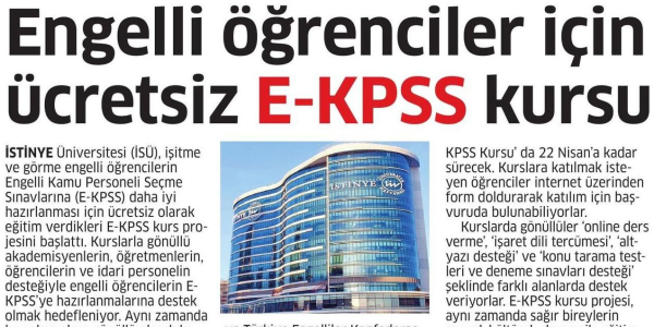 İSTİNYE Üniversitesi (İSÜ), işitme ve görme engelli öğrencilerin Engelli Kamu Personeli Seçme Sınavlarına (E-KPSS) daha iyi hazırlanması için ücretsiz olarak eğitim verdikleri E-KPSS kurs projesini başlattı. Kurslarla gönüllü akademisyenlerin, öğretmenlerin, öğrencilerin ve idari personelin desteğiyle engelli öğrencilerin E-KPSS'ye hazırlanmalarına destek olmak hedefleniyor. Aynı zamanda bu çalışmalara gönüllü olarak katılan üniversite öğrencilerinin özellikle toplumsal sorumluluk bilinci ve farklı bireylerle iletişim becerilerinin geliştirebilmelerine olanak tanımak amaçlanıyor.