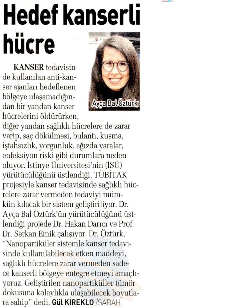 Kanser tedavisinde kullanılan anti-kanser ajanları hedeflenen bölgeye ulaşamadığından bir yandan kanser hücrelerini öldürürken, diğer yandan sağlıklı hücrelere de zarar verip, saç dökülmesi, bulantı, kusma, iştahsızlık, yorgunluk, ağızda yaralar, enfeksiyon riski gibi durumlara neden oluyor. İstinye Üniversitesi'nin (İSÜ) yürütücülüğünü üstlendiği, TÜBİTAK projesiyle kanser tedavisinde sağlıklı hücrelere zarar vermeden tedaviyi mümkün kılacak bir sistem geliştiriliyor. Dr. Ayça Bal Öztürk'ün yürütücülüğünü üstlendiği projede Dr. Hakan Darıcı ve Prof. Dr. Serkan Emik çalışıyor.