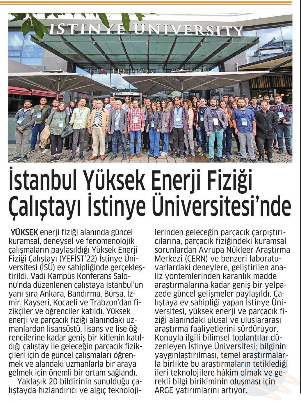 Yüksek enerji fiziği alanında güncel kuramsal, deneysel ve fenomenolojik çalışmaların paylaşıldığı Yüksek Enerji Fiziği Çalıştayı (YEFİST'22) İstinye Üniversitesi (İSÜ) ev sahipliğinde gerçekleştirildi. Vadi Kampüs Konferans Salonu'nda düzenlenen çalıştaya İstanbul'un yanı sıra Ankara, Bandırma, Bursa, İzmir, Kayseri, Kocaeli ve Trabzon'dan fizikçiler ve öğrenciler katıldı. Yüksek enerji ve parçacık fiziği alanındaki uzmanlardan lisansüstü, lisans ve lise öğrencilerine kadar geniş bir kitlenin katıldığı çalıştay ile geleceğin parçacık fizikçileri için de güncel çalışmaları öğrenmek ve alandaki uzmanlarla bir araya gelmek için önemli bir ortam sağlandı.