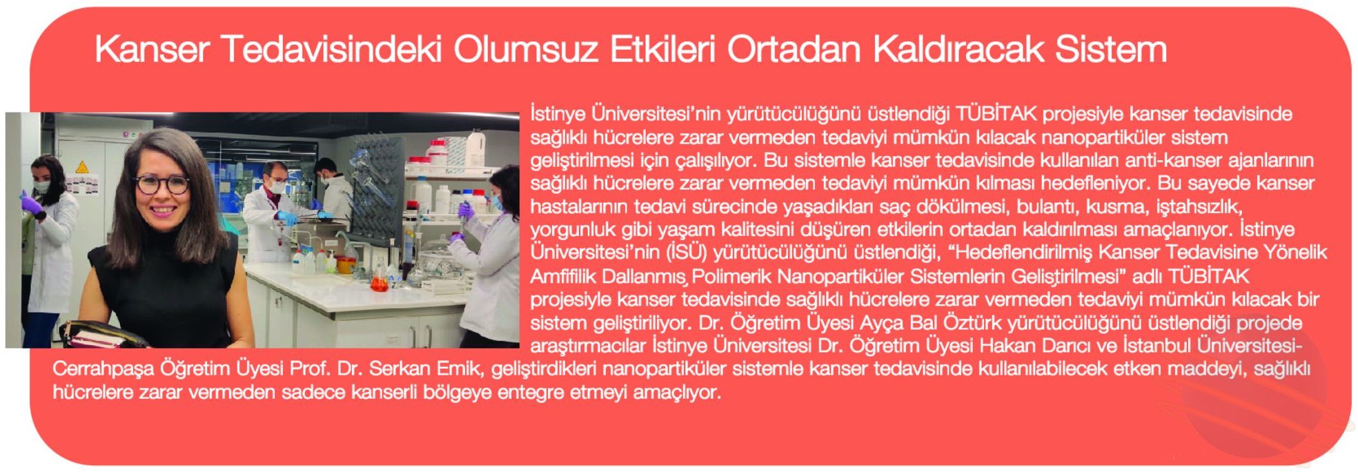 İstinye Üniversitesi'nin yürütücülüğünü üstlendiği TÜBİTAK projesiyle kanser tedavisinde sağlıklı hücrelere zarar vermeden tedaviyi mümkün kılacak nanopartiküler sistem geliştirilmesi için çalışılıyor. Bu sistemle kanser tedavisinde kullanılan anti-kanser ajanlarının sağlıklı hücrelere zarar vermeden tedaviyi mümkün kılması hedefleniyor. Bu sayede kanser hastalarının tedavi sürecinde yaşadıkları saç dökülmesi, bulantı, kusma, iştahsızlık, yorgunluk gibi yaşam kalitesini düşüren etkilerin ortadan kaldırılması amaçlanıyor. İstinye Üniversitesi'nin (İSÜ) yürütücülüğünü üstlendiği, "Hedeflendirilmiş Kanser Tedavisine Yönelik Amfıfilik Dallanmış, Polimerik Nanopartiküler Sistemlerin Geliştirilmesi" adlı TÜBİTAK projesiyle kanser tedavisinde sağlıklı hücrelere zarar vermeden tedaviyi mümkün kılacak bir sistem geliştiriliyor. Dr. Öğretim Üyesi Ayça Bal Öztürk yürütücülüğünü üstlendiği projede araştırmacılar İstinye Üniversitesi Dr. Öğretim Üyesi Hakan Darıcı ve İstanbul Üniversitesi Cerrahpaşa Öğretim Üyesi Prof. Dr. Serkan Emik, geliştirdikleri nanopartiküler sistemle kanser tedavisinde kullanılabilecek etken maddeyi, sağlıklı hücrelere zarar vermeden sadece kanserli bölgeye entegre etmeyi amaçlıyor.