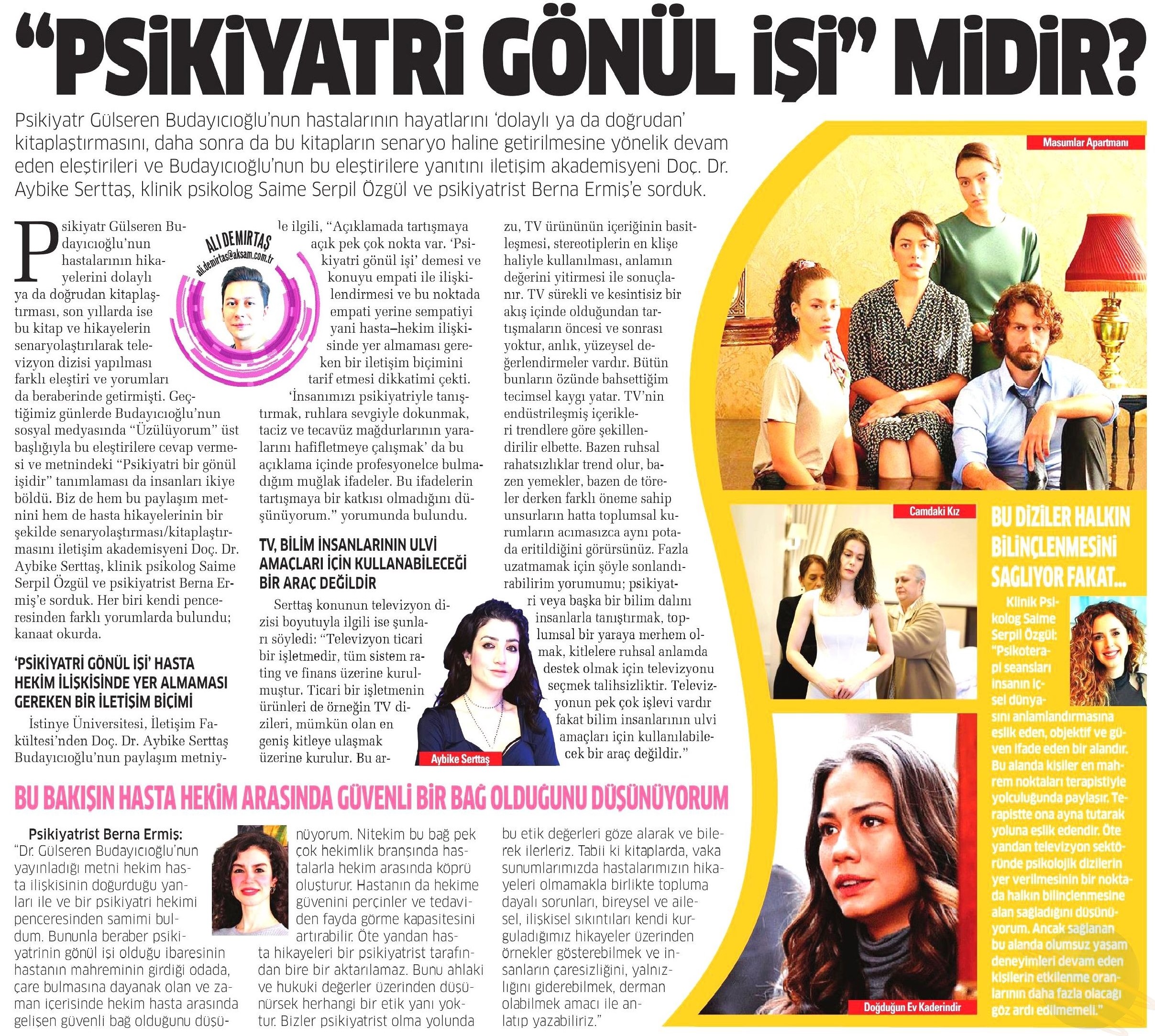 Klinik Psikolog Saime Serpil Özgül: "Psikoterapi seansları insanın içsel dünyasını anlamlandırmasına eşlik eden, objektif ve güven ifade eden bir alandır. Bu alanda kişiler en mahrem noktaları terapistiyle yolculuğunda paylaşır. Terapistte ona ayna tutarak yoluna eşlik edendir. Her bir meslektaşımın çalıştığı ekol farklı olabileceği gibi ilişki kurabilme becerileri de farklılık gösterebilir. Ama burada asıl olan empatinin sağlıklı bir şekilde kurulmasıdır. Öte yandan televizyon sektöründe psikolojik dizilerin yer verilmesinin bir noktada halkın bilinçlenmesine alan sağladığını düşünüyorum. Ancak sağlanan bu alanda olumsuz yaşam deneyimleri devam eden kişilerin etkilenme oranlarının daha fazla olacağının göz ardı edilmemesinin gerekli olduğu kanaatindeyim."