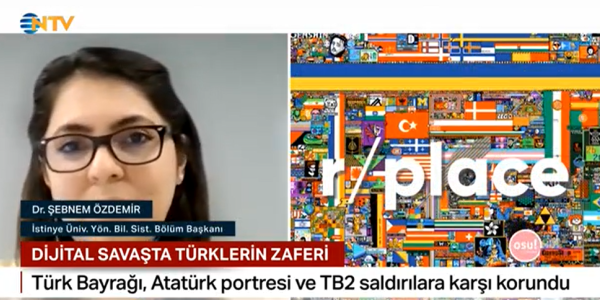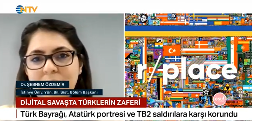 İktisadi İdari ve Sosyal Bilimler Fakültesi Yönetim Bilişim Sistemleri İngilizce Bölüm Başkanımız Dr. Öğr. Üyesi Şebnem Özdemir, Sosyal ağ Reddit’in düzenlediği ve 6 milyondan fazla kullanıcının dijital tuvalı boyadığı etkinliği değerlendirdi. Milyonlarca kullanıcının katılımıyla düzenlenen yıllık piksel boya etkinliğinde, Türk kullanıcıların yaptığı; Türk Bayrağı, Atatürk Portresi ve TB2 resimleri saldırılara karşı korundu.