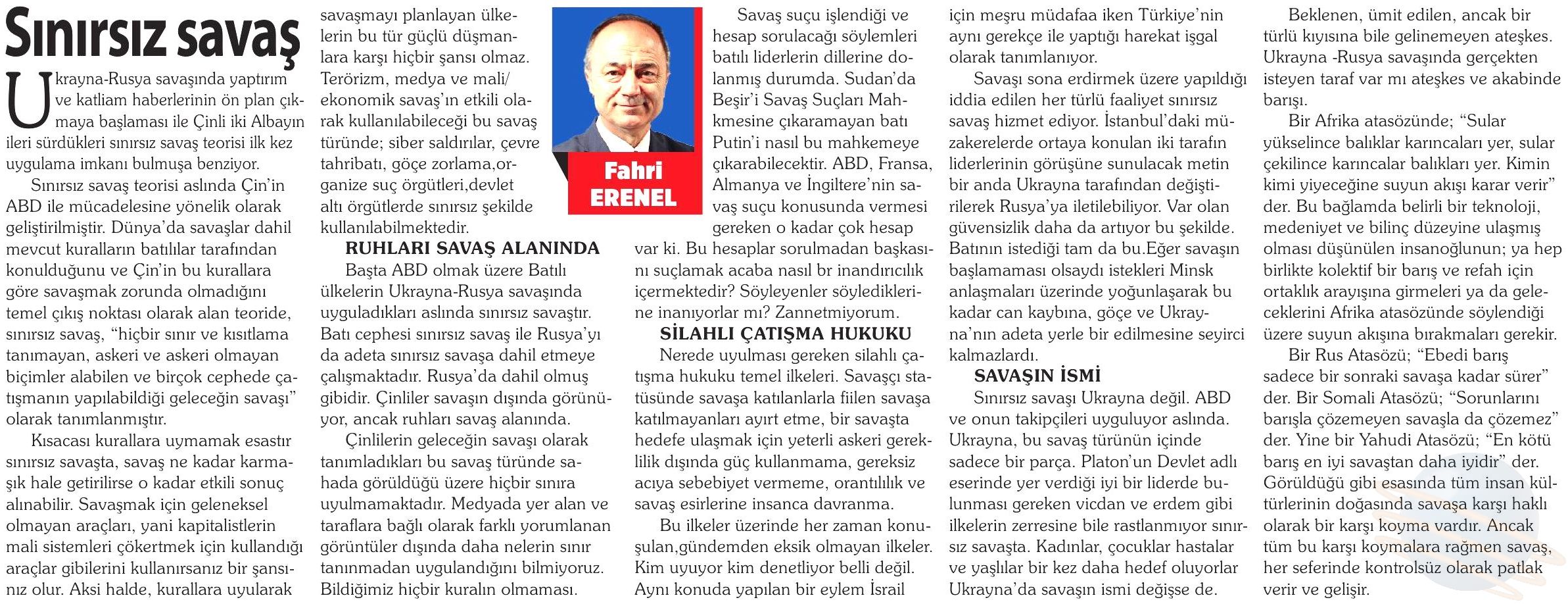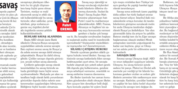 Sınırsız savaşı Ukrayna değil. ABD ve onun takipçileri uyguluyor aslında. Ukrayna, bu savaş türünün içinde sadece bir parça. Platon'un Devlet adlı eserinde yer verdiği iyi bir liderde bulunması gereken vicdan ve erdem gibi ilkelerin zerresine bile rastlanmıyor sınırsız savaşta. Kadınlar, çocuklar hastalar ve yaşlılar bir kez daha hedef oluyorlar Ukrayna'da savaşın ismi değişse de. Beklenen, ümit edilen, ancak bir türlü kıyısına bile gelinemeyen ateşkes. Ukrayna -Rusya savaşında gerçekten isteyen taraf var mı ateşkes ve akabinde barışı. Bir Afrika atasözünde; "Sular yükselince balıklar karıncaları yer, sular çekilince karıncalar balıkları yer. Kimin kimi yiyeceğine suyun akışı karar verir" der. Bu bağlamda belirli bir teknoloji, medeniyet ve bilinç düzeyine ulaşmış olması düşünülen insanoğlunun; ya hep birlikte kolektif bir barış ve refah için ortaklık arayışına girmeleri ya da geleceklerini Afrika atasözünde söylendiği üzere suyun akışına bırakmaları gerekir.