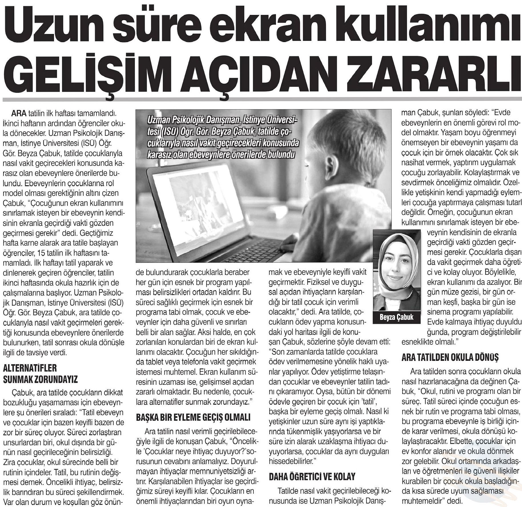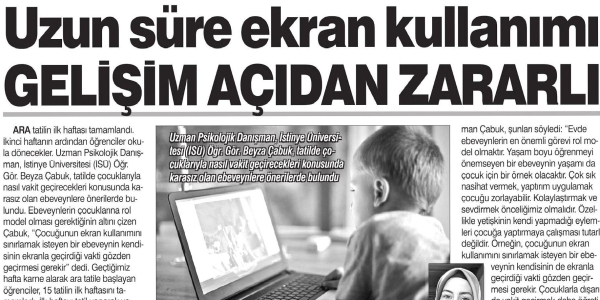 Ara tatilin ilk haftası tamamlandı. İkinci haftanın ardından öğrenciler okula dönecekler. Uzman Psikolojik Danışman, İstinye Üniversitesi (İSÜ) Öğr. Gör. Beyza Çabuk, tatilde çocuklarıyla nasıl vakit geçirecekleri konusunda karasız olan ebeveynlere önerilerde bulundu. Ebeveynlerin çocuklarına rol model olması gerektiğinin altını çizen Çabuk, "Çocuğunun ekran kullanımını sınırlamak isteyen bir ebeveynin kendisinin ekranla geçirdiği vakti gözden geçirmesi gerekir" dedi. Geçtiğimiz hafta karne alarak ara tatile başlayan öğrenciler, 15 tatilin ilk haftasını tamamladı. İlk haftayı tatil yaparak ve dinlenerek geçiren öğrenciler, tatilin ikinci haftasında okula hazırlık için de çalışmalarına başlıyor. Uzman Psikolojik Danışman, İstinye Üniversitesi (İSÜ) Öğr. Gör. Beyza Çabuk, ara tatilde çocuklarıyla nasıl vakit geçirmeleri gerektiği konusunda ebeveynlere önerilerde bulunurken, tatil sonrası okula dönüşle ilgili de tavsiye verdi.