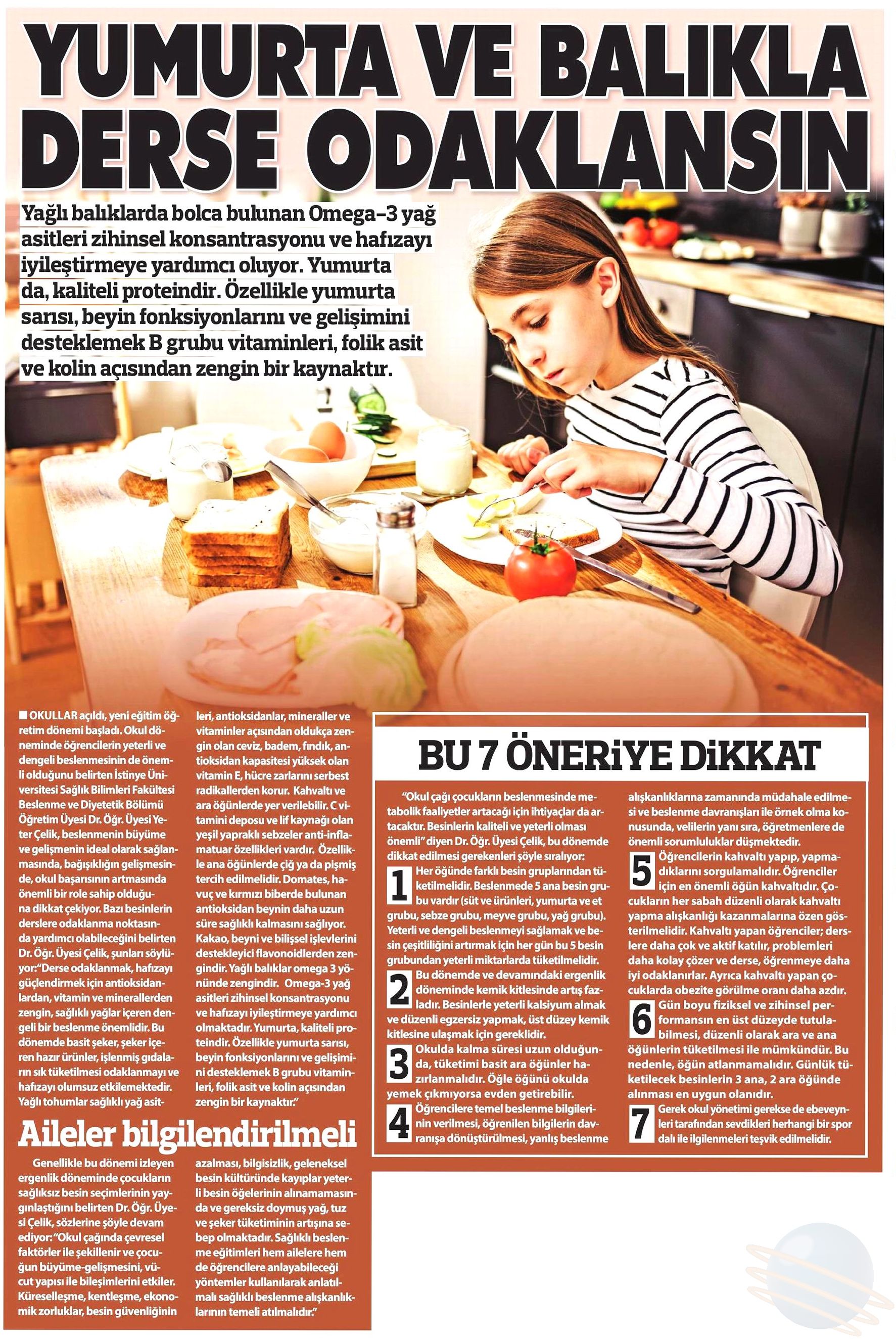 OKULLAR açıldı, yeni eğitim öğretim dönemi başladı. Okul döneminde öğrencilerin yeterli ve dengeli beslenmesinin de önemli olduğunu belirten İstinye Üniversitesi Sağlık Bilimleri Fakültesi Beslenme ve Diyetetik Bölümü Öğretim Üyesi Dr. Öğr. Üyesi Yeter Çelik, beslenmenin büyüme ve gelişmenin ideal olarak sağlanmasında, bağışıklığın gelişmesinde, okul başarısının artmasında önemli bir role sahip olduğuna dikkat çekiyor. Bazı besinlerin derslere odaklanma noktasında yardımcı olabileceğini belirten Dr. Öğr. Üyesi Çelik, şunları söylüyor: "Derse odaklanmak, hafızayı güçlendirmek için antioksidanlardan, vitamin ve minerallerden zengin, sağlıklı yağlar içeren dengeli bir beslenme önemlidir. Bu dönemde basit şeker, şeker içeren hazır ürünler, işlenmiş gıdaların sık tüketilmesi odaklanmayı ve hafızayı olumsuz etkilemektedir. Yağlı tohumlar sağlıklı yağ asitleri, antioksidanlar, mineraller ve vitaminler açısından oldukça zengin olan ceviz, badem, fındık, antioksidan kapasitesi yüksek olan vitamin E, hücre zarlarını serbest radikallerden korur. Kahvaltı ve ara öğünlerde yer verilebilir. C vitamini deposu ve lif kaynağı olan yeşil yapraklı sebzeler anti-inflamatuar özellikleri vardır. Özellikle ana öğünlerde çiğ ya da pişmiş tercih edilmelidir. Domates, havuç ve kırmızı biberde bulunan antioksidan beynin daha uzun süre sağlıklı kalmasını sağlıyor. Kakao, beyni ve bilişsel işlevlerini destekleyici flavonoidlerden zengindir. Yağlı balıklar omega 3 yönünde zengindir. Omega-3 yağ asitleri zihinsel konsantrasyonu ve hafızayı iyileştirmeye yardımcı olmaktadır. Yumurta, kaliteli proteindir. Özellikle yumurta sarısı, beyin fonksiyonlarını ve gelişimini desteklemek B grubu vitaminleri, folik asit ve kolin açısından zengin bir kaynaktır."