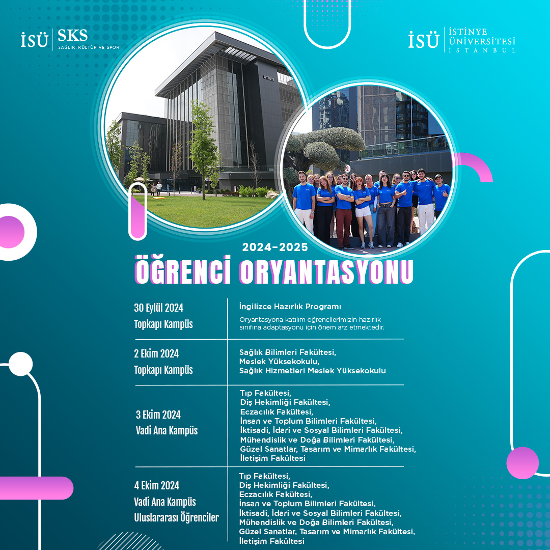 2-3-4 Ekim 2024 tarihlerinde, idari ve akademik birimlerimizle beraber Topkapı Kampüs, Vadi Ana Kampüs ve Vadi H Kampüs buluşuyoruz. Sizlere üniversitemizin vizyonunu ve felsefesini aktarmak, akademik ve sosyal yapısı ile sunduğumuz olanakları tanıtmak ve üniversite yaşamına uyum sürecinizi hızlandırmak için hazırladığımız İstinye Üniversite Oryantasyon Programı sizleri bekliyor.