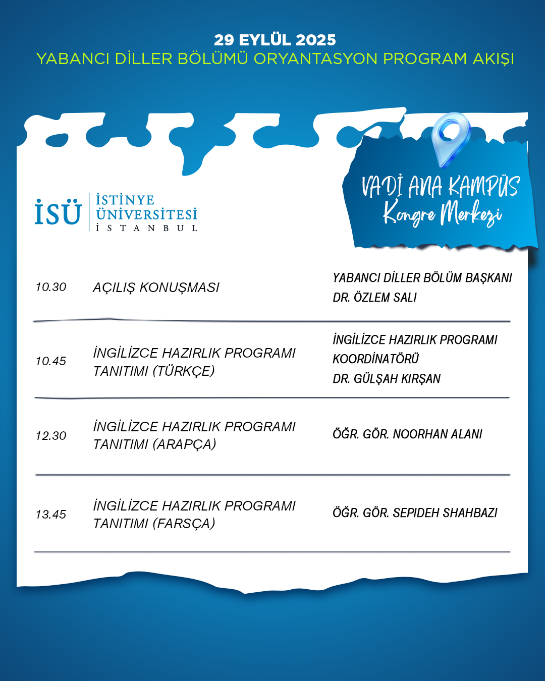 🔔 Not: İngilizce Hazırlık Programı’na katılacak öğrencilerimizin bu oryantasyona mutlaka katılması önerilir. Program, hazırlık sınıfına daha kolay adapte olmanızı sağlayacak önemli bilgiler içermektedir.