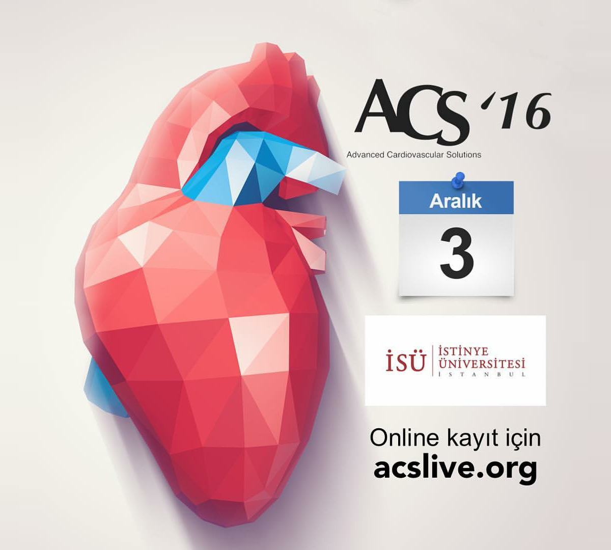 "ACS'16 Focus: İleri Kardiyovasküler Çözümler" Sempozyumu 3 Aralık 2016 tarihinde ,İstinye Üniversitesi Topkapı Sağlık Kampüsünde düzenlenmektedir.Kardiyolojide Yeni Teknoloji ve Bilgilerin İnteraktif olarak tartışıldığı, Uluslararası Katılımcıların da bulunacakları bu Bilimsel Platforma Davetlisiniz...