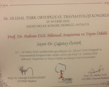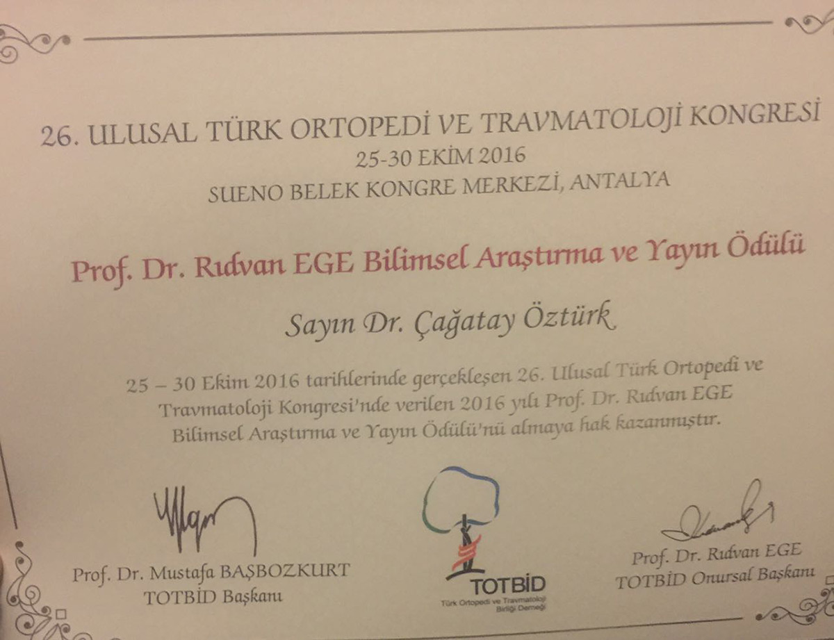 Liv Hospital Ortopedi ve Travmatoloji Uzmanı Doç. Dr. Çağatay Öztürk, Türk Ortopedi ve Travmatoloji Derneği tarafından Prof. Rıdvan Ege Bilimsel Araştırma ve Yayın ödülüne layık görüldü. Doç. Dr. Çağatay Öztürk’ün yurtdışında 120’den fazla yayını bulunuyor ve çok önemli 6 uluslararası dernekte yöneticilik yapıyor. “Rıdvan Ege Bilimsel Ödülü” 50 yaşını doldurmamış ortopedi ve travmatoloji uzmanları arasından, uluslararası düzeyde en çok yayın yapmış ve Ülkemizi uluslararası platformlarda en iyi şekilde temsil etmiş kişilere veriliyor.