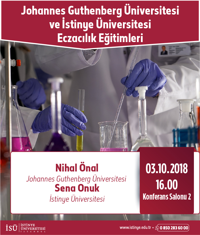 İstinye Üniversitesi Eczacılık Fakültesi tarafından düzenlenen "Johannes Gutenberg Üniversitesi ve İstinye Üniversitesi Eczacılık Eğitimleri" adlı seminer, 3 Ekim Çarşamba günü saat 16.00'da İstinye Üniversitesi Topkapı Kampüsü Konferans salonu 2'de gerçekleşecek.