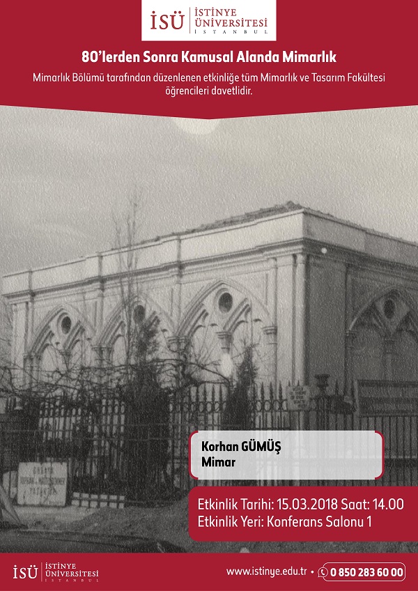 “80’lerden sonra Kamusal Alanda Mimarlık” başlıklı etkinlik, mimar Korhan GÜMÜŞ’ün katılımıyla 15.03.2018 Perşembe günü Saat 14.00’te İstinye Üniversitesi Topkapı Kampüsü Konferans Salonu 1’de gerçekleştirilecektir. Tüm öğrenci ve öğretim görevlilerimizin katılımına açıktır.