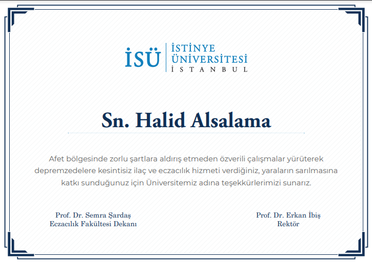 Afet bölgesinde zorlu şartlara aldırış etmeden özverili çalışmalar yürüterek depremzedelere kesintisiz ilaç ve eczacılık hizmeti verdiğiniz, yaraların sarılmasına katkı sunduğunuz için Üniversitemiz adına teşekkürlerimizi sunarız.