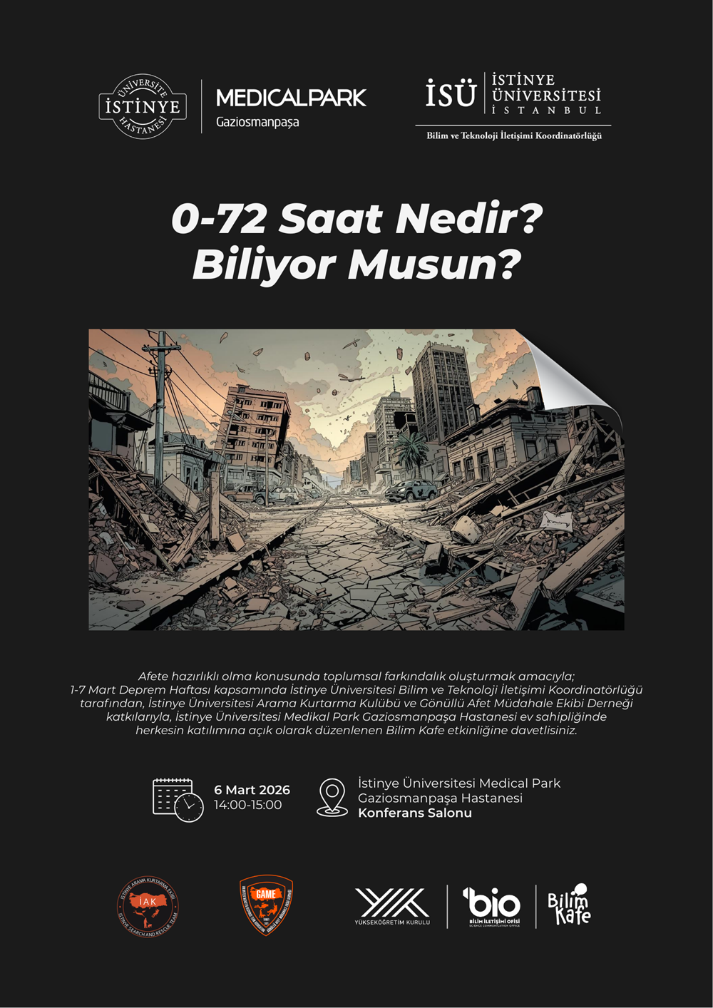 Afete hazırlıklı olma konusunda toplumsal farkındalık oluşturmak amacıyla; 1-7 Mart Deprem Haftası kapsamında İstinye Üniversitesi Bilim ve Teknoloji İletişimi Koordinatörlüğü tarafından, İstinye Üniversitesi Arama Kurtarma Kulübü ve Gönüllü Afet Müdahale Ekibi Derneği katkılarıyla, İstinye Üniversitesi Medikal Park Gaziosmanpaşa Hastanesi ev sahipliğinde herkesin katılımına açık olarak düzenlenen Bilim Kafe etkinliğine davetlisiniz.