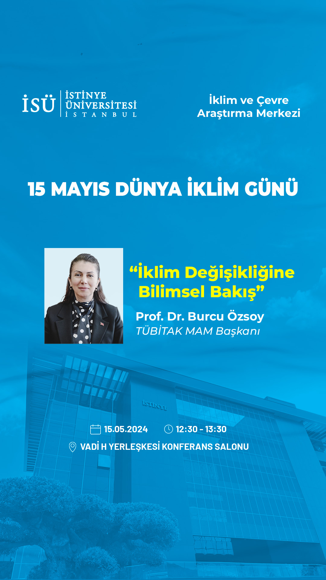 TÜBİTAK Marmara Araştırma Merkezi (MAM) Başkanı Prof. Dr. Burcu Özsoy’un da katılacağı “İklim Değişikliğine Bilimsel Bakış” konferansı 15 Mayıs'ta Vadi H Yerleşkesi Konferans Salonunda gerçekleşecek.