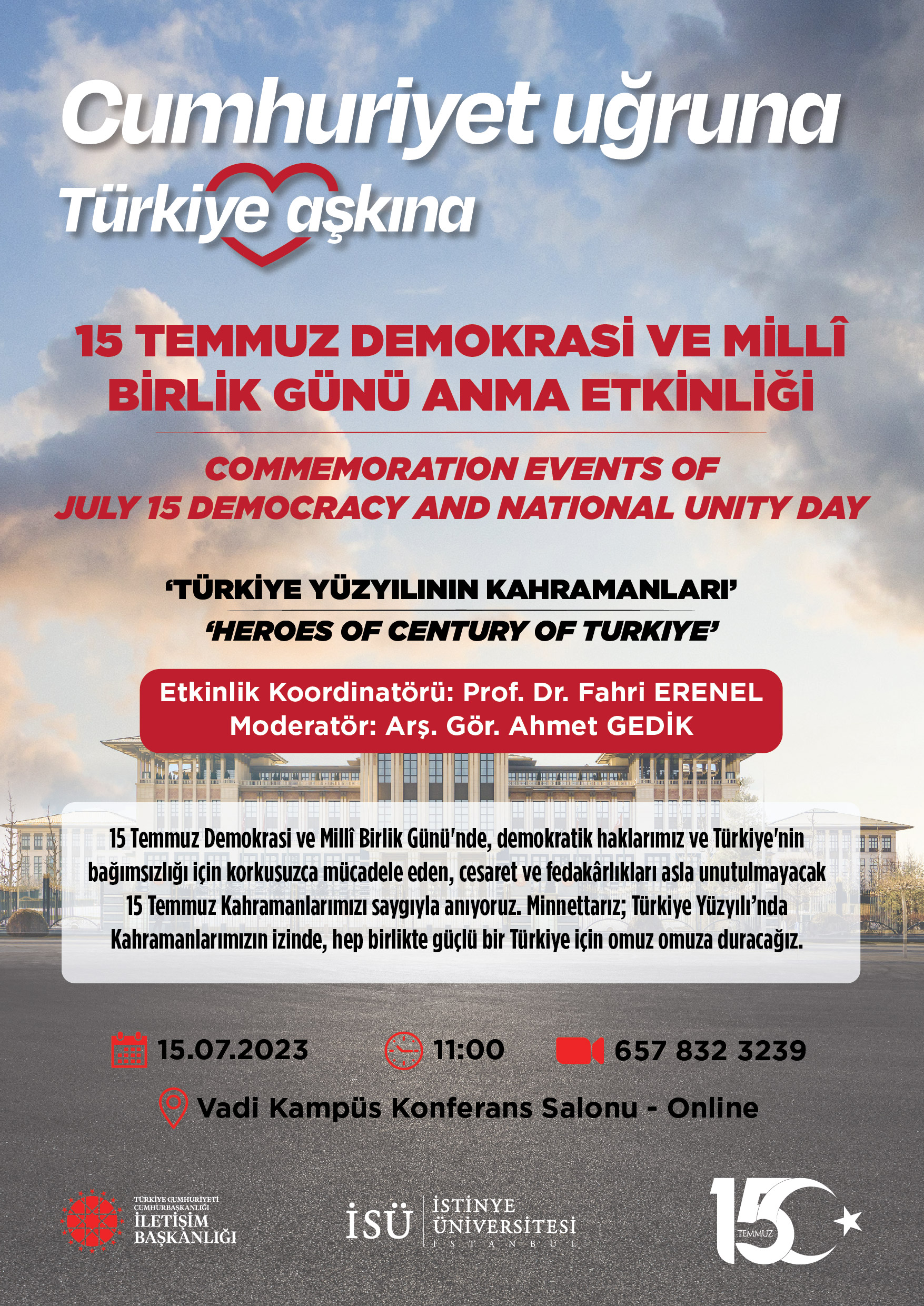 İstinye Üniversitesi tarafından 15 Temmuz Cumartesi günü saat 11.00'de Vadi Kampüs Konferans Salonu ve Zoom üzerinden gerçekleştirilecek etkinliğe davetlisiniz.