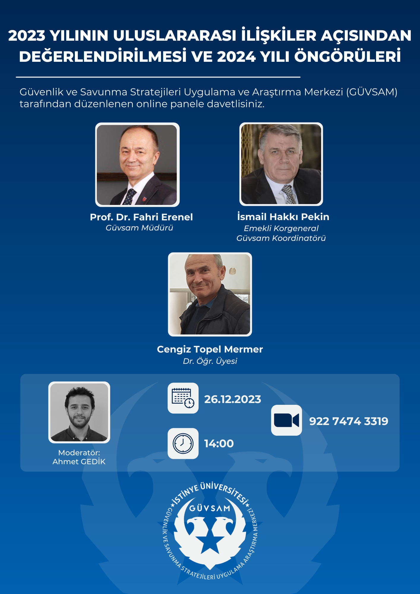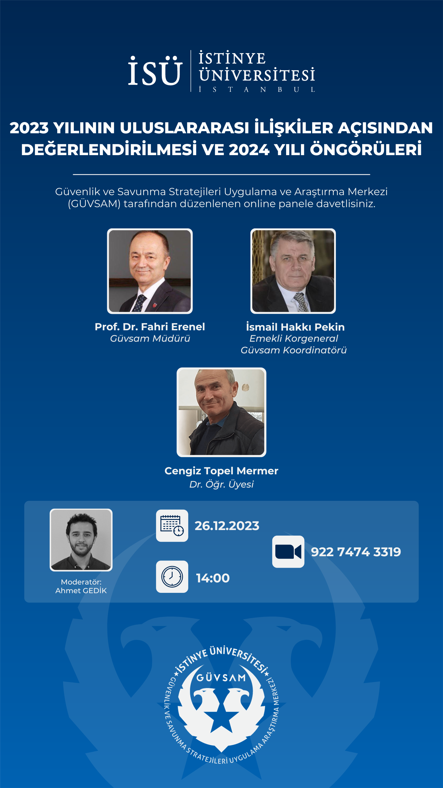 Güvenlik ve Savunma Stratejileri Uygulama ve Araştırma Merkezi (GÜVSAM) tarafından 26 Aralık 2023 Salı günü saat 14.00'de çevrim içi olarak gerçekleştirilecek etkinliğe davetlisiniz.