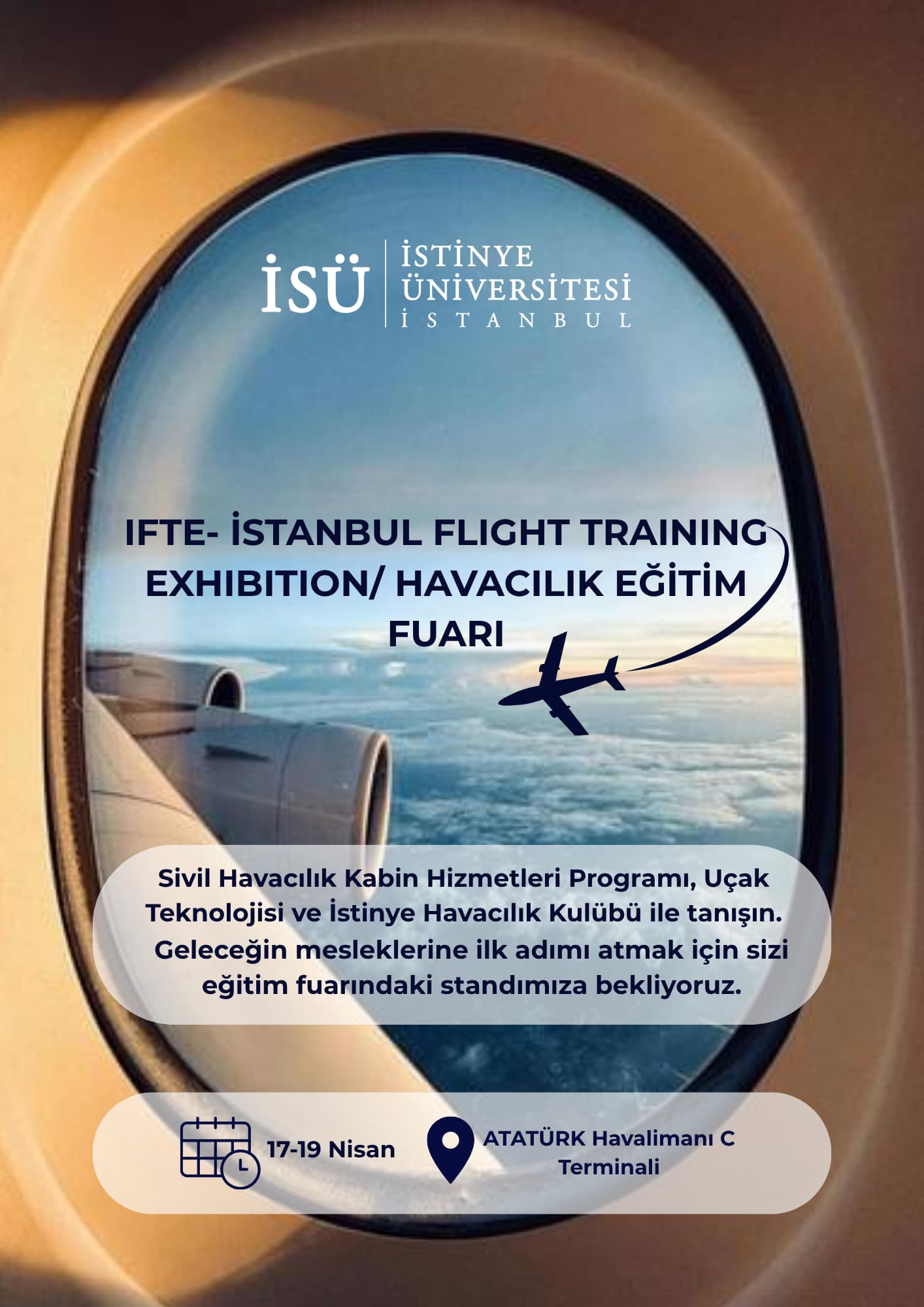 İstinye Üniversitesi Sivil Havacılık Kabin Hizmetleri Programı tarafından 17-18-19 Nisan 2026 tarihleri arasında Atatürk Havalimanı C Terminali'nde gerçekleştirilecek olan 2026 IFTE - İstanbul Havacılık Eğitim Fuarı'na davetlisiniz.