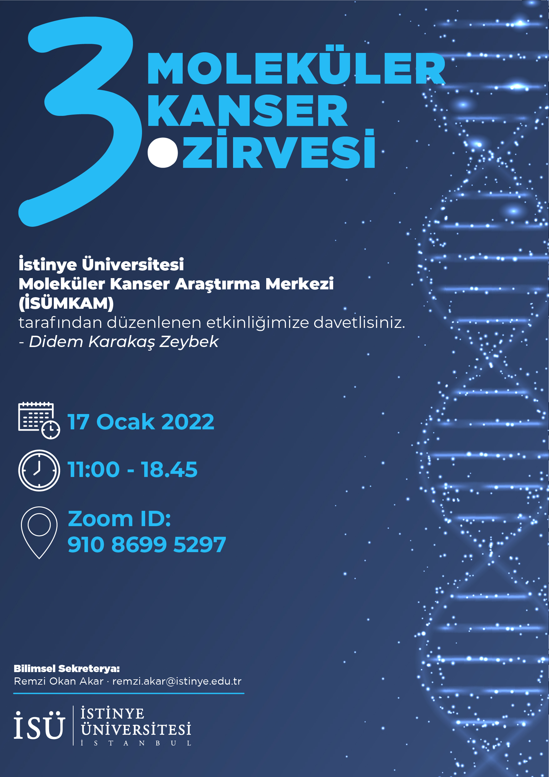 İstinye Üniversitesi Moleküler Kanser Araştırma Merkezi ( İSÜMKAM ) tarafından 17 Ocak Pazartesi Günü saat 11.00'de gerçekleştirilecek çevrimiçi etkinliğe davetlisiniz.
