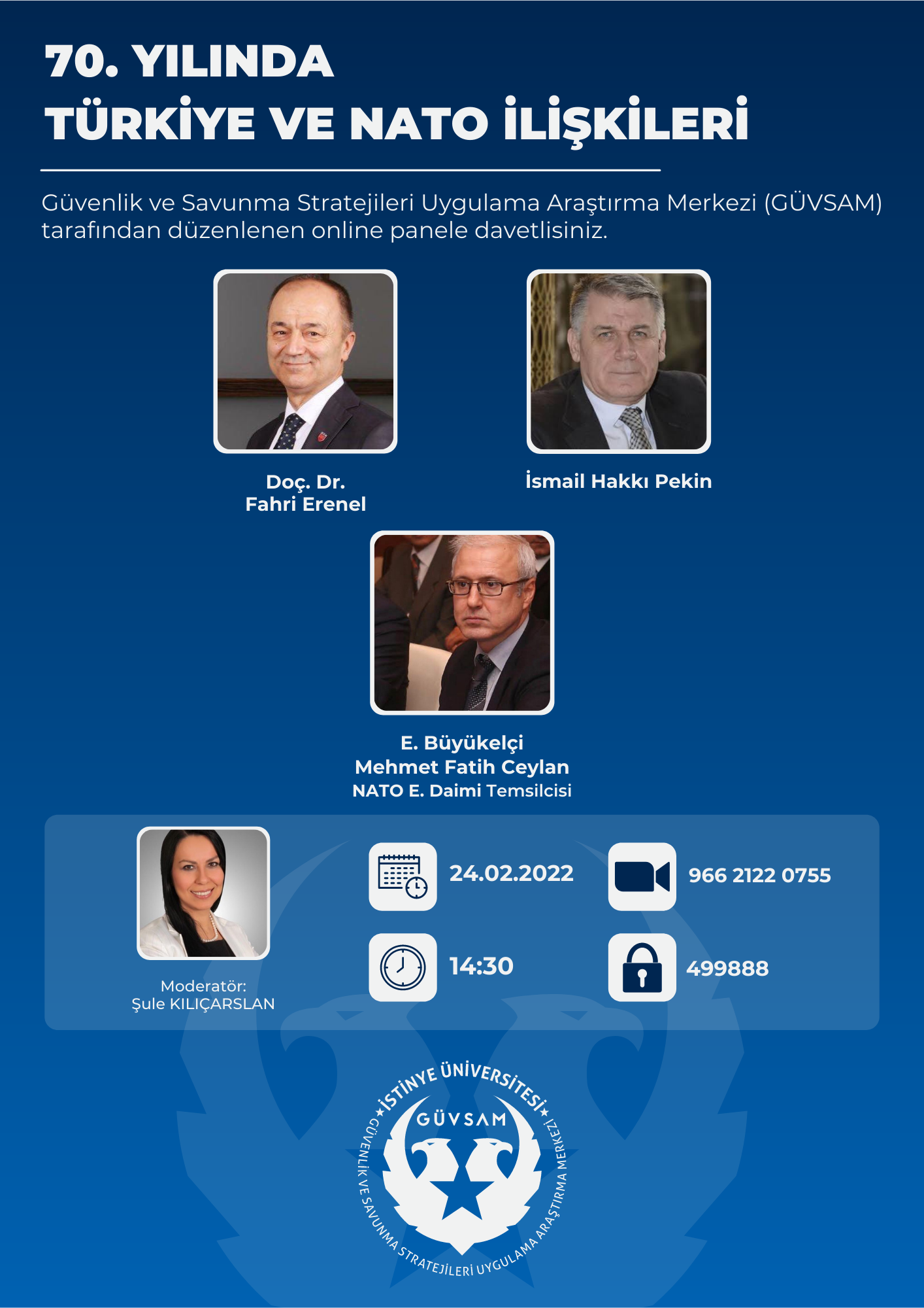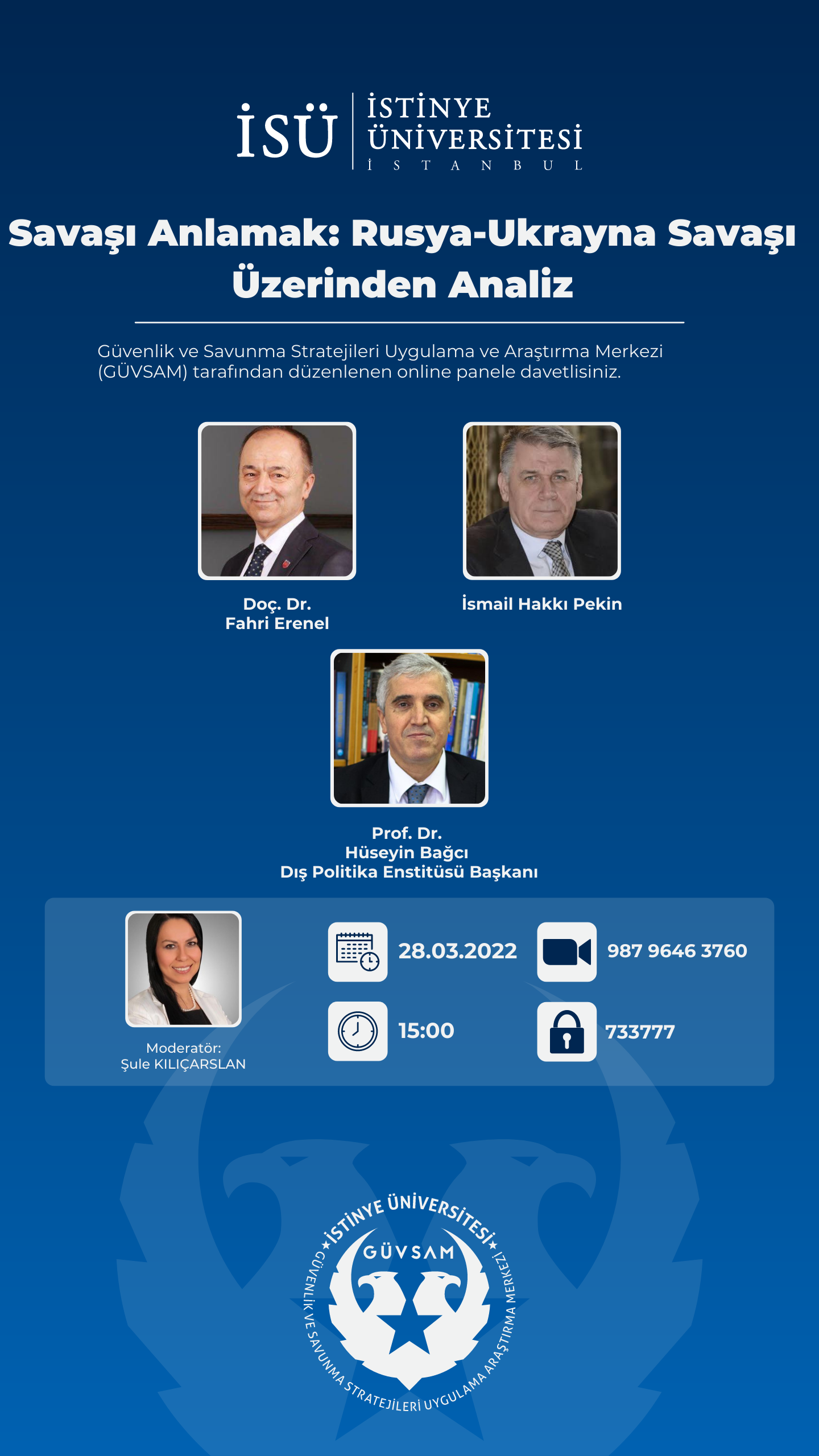 Güvenlik ve Savunma Stratejileri Uygulama Araştırma Merkezi (GÜVSAM) tarafından 24 Şubat Perşembe Günü saat 14.30'da çevrimiçi olarak gerçekleştirilecek etkinliğe davetlisiniz.
