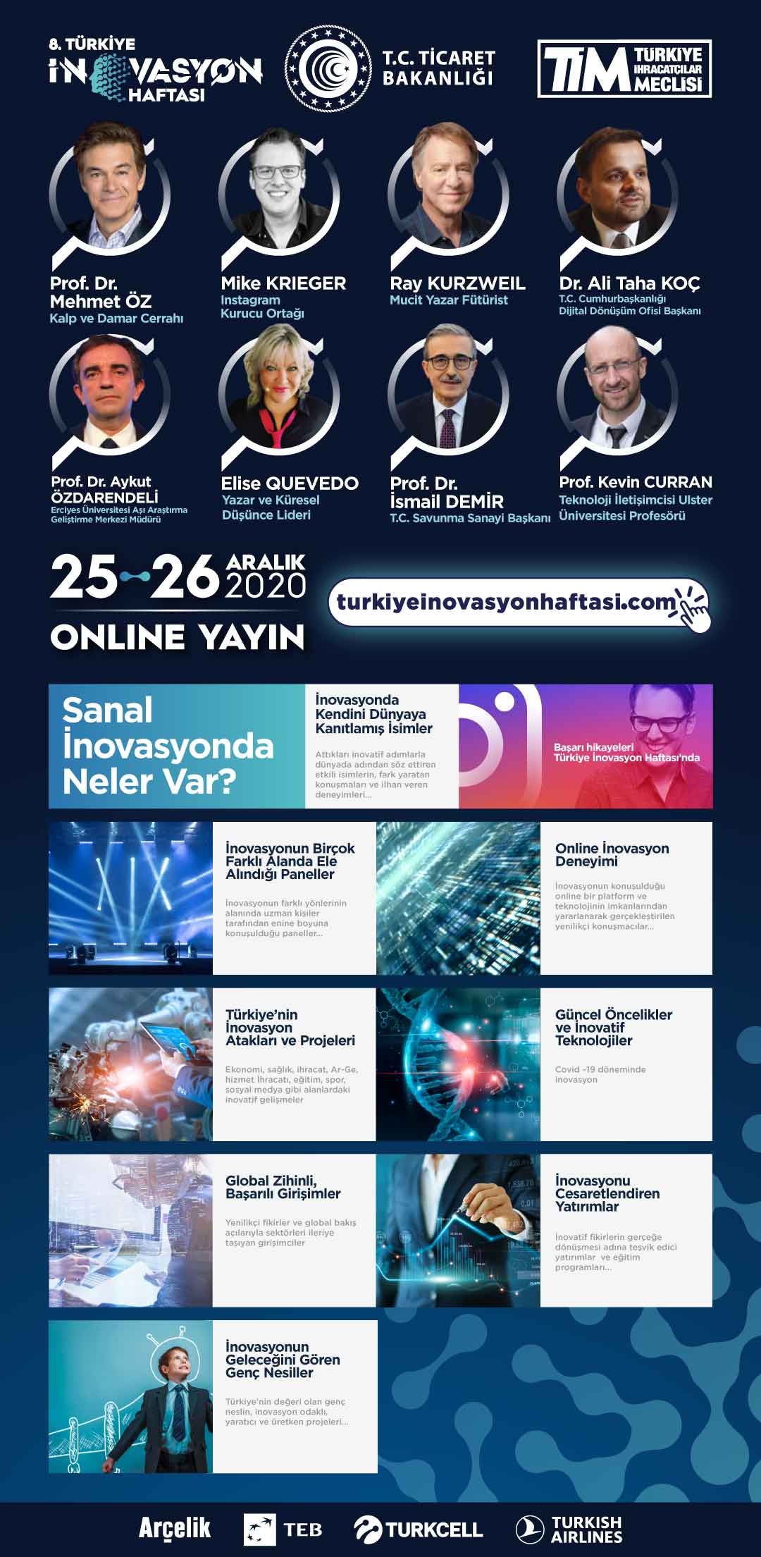 T.C. Ticaret Bakanlığı katkılarıyla gerçekleştirilen Türkiye İnovasyon Haftası etkinliği, bu yıl 25- 26 Aralık 2020 tarihlerinde sanal olarak gerçekleştirilecektir.