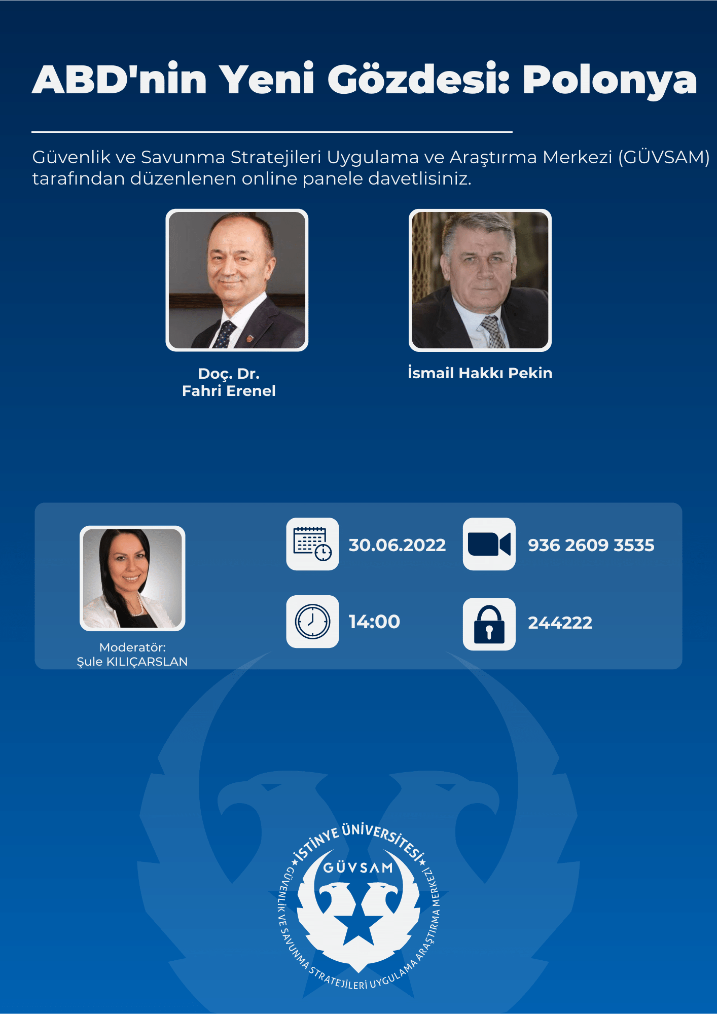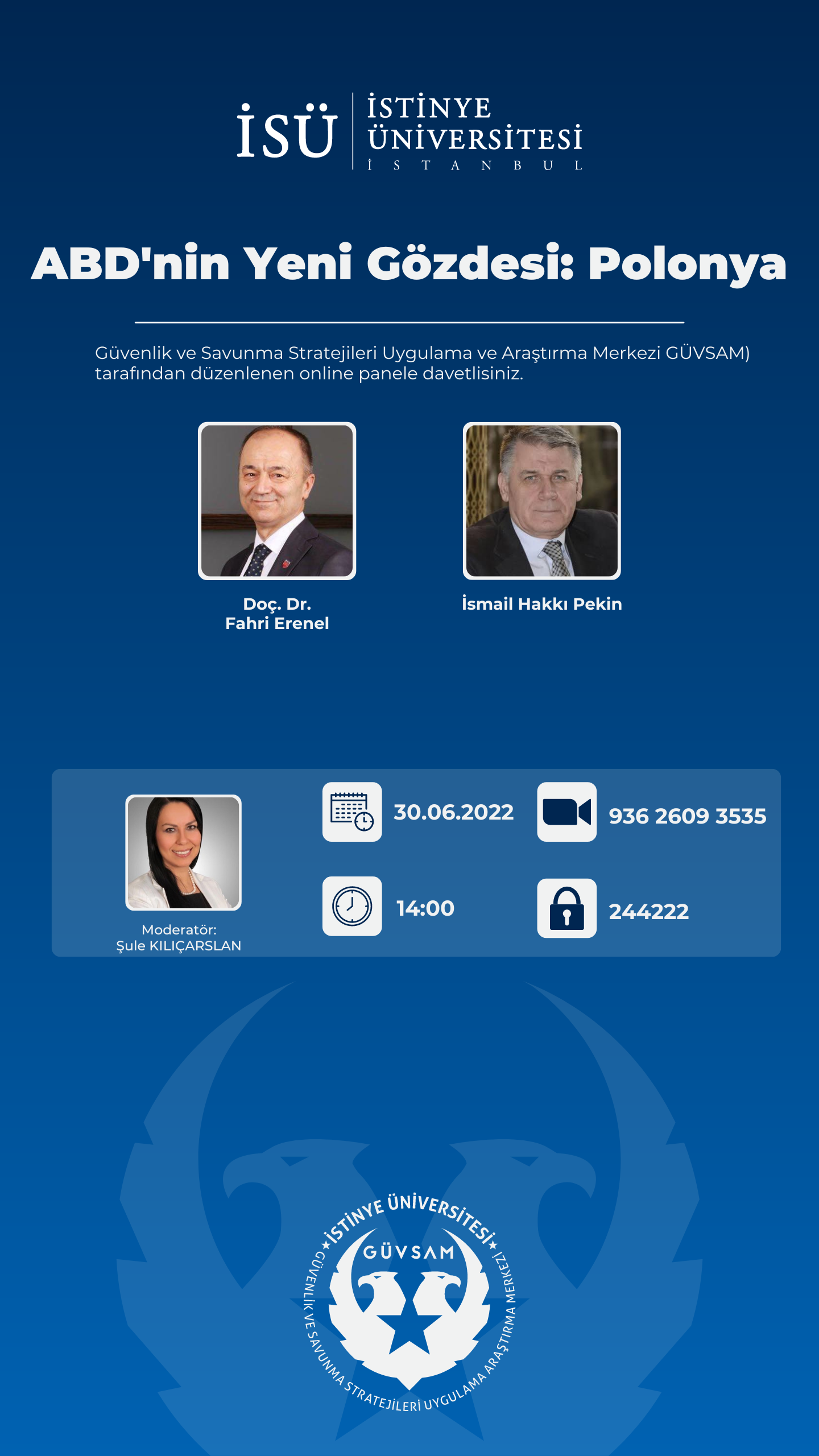 Güvenlik ve Savunma Stratejileri Uygulama Araştırma Merkezi (GÜVSAM) tarafından 30 Haziran Perşembe Günü saat 14.00'de çevrim içi olarak gerçekleştirilecek etkinliğe davetlisiniz.