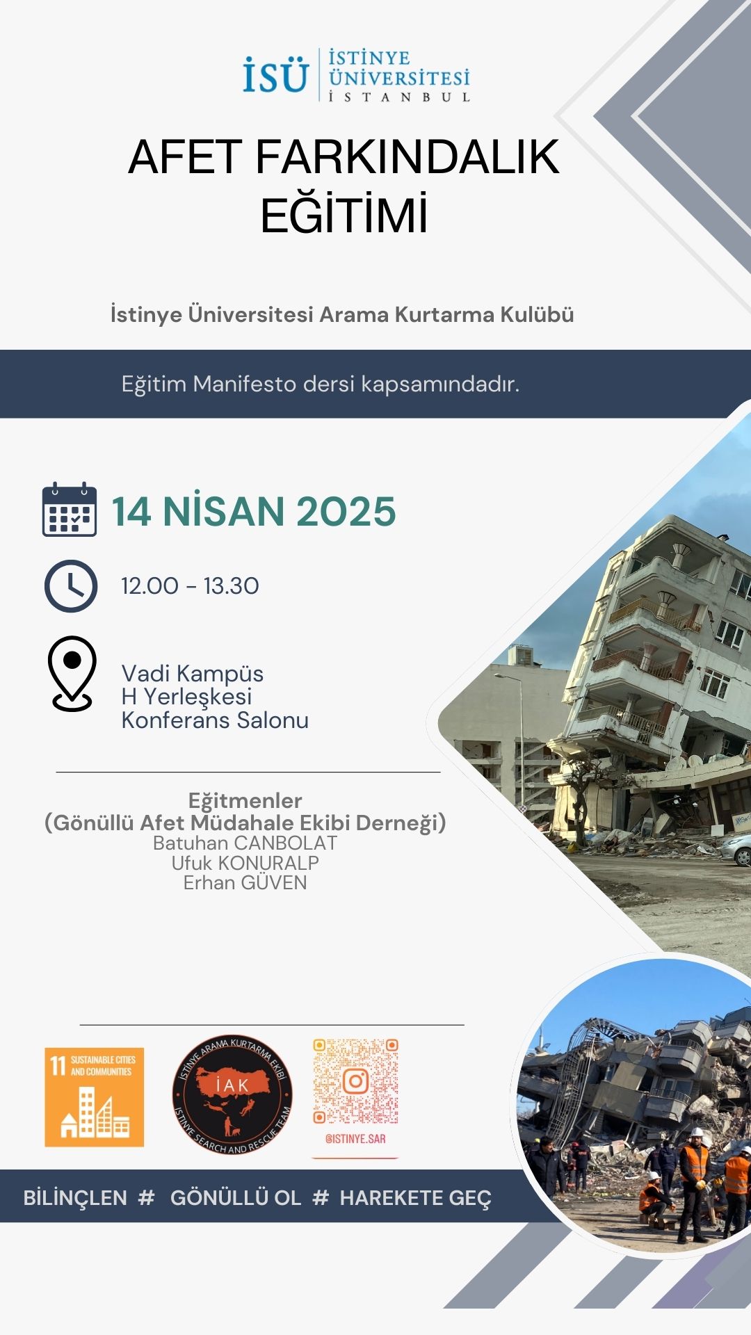 İstinye Üniversitesi Arama Kurtarma Kulübü tarafından düzenlenen, Manifesto dersi kapsamında değerlendirilecek olan "Afet Farkındalık Eğitimi" ne davetlisiniz.