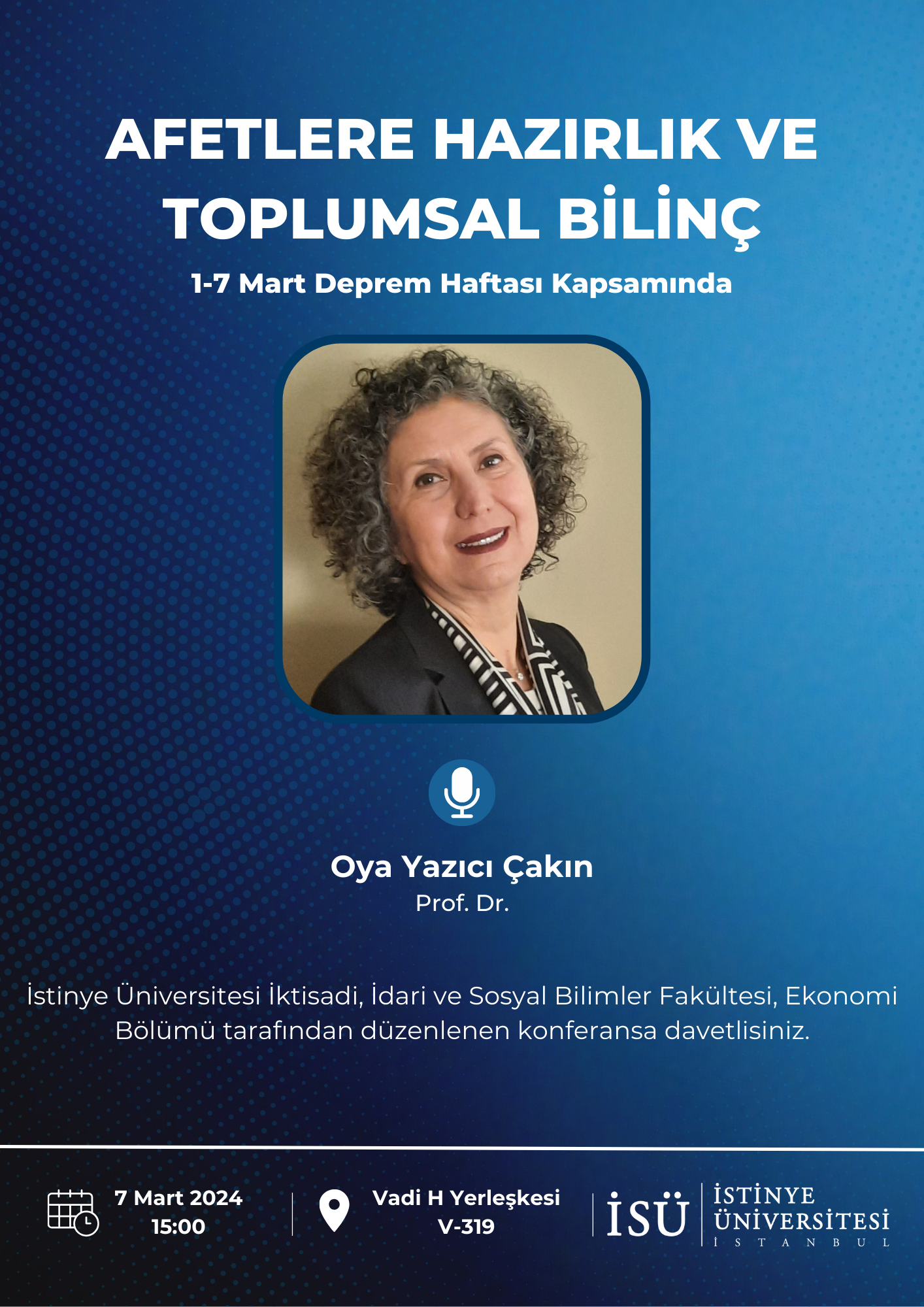 İstinye Üniversitesi, İktisadi, İdari ve Sosyal Bilimler Fakültesi Ekonomi Bölümü tarafından 1- 7 Mart Deprem Haftası kapsamında, 7 Mart 2024 Perşembe günü saat 15:00'te Vadi H Yerleşkesi V-319'da gerçekleştirilecek konferansa davetlisiniz.