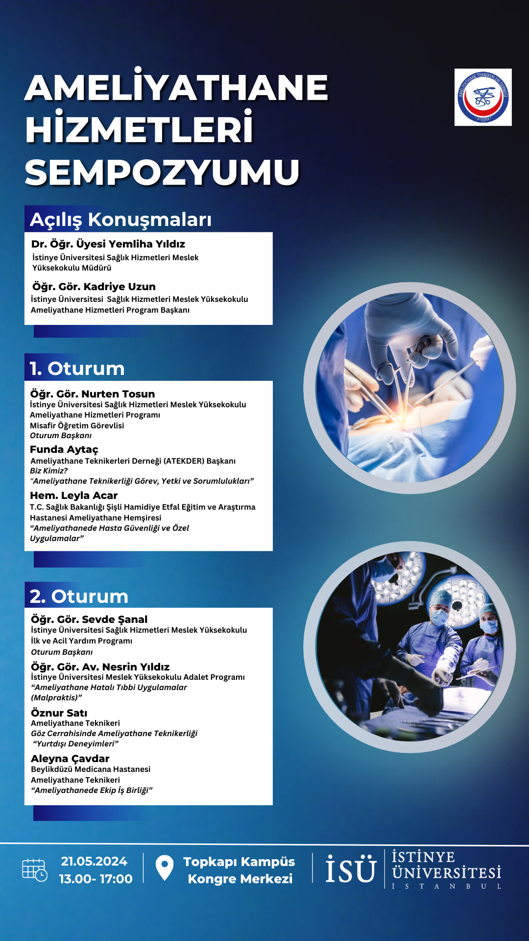 İstinye Üniversitesi Sağlık Hizmetleri Meslek Yüksekokulu Ameliyathane Hizmetleri Programı tarafından 21 Mayıs 2024 Salı günü saat 13:00'da gerçekleştirilecek sempozyuma davetlisiniz.