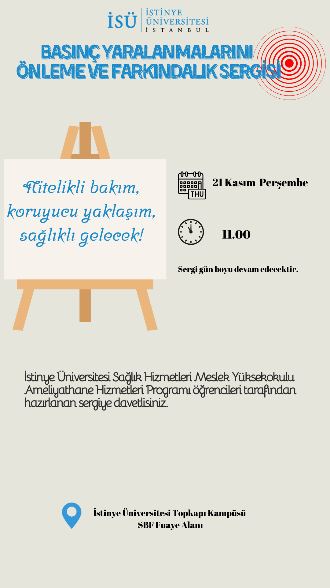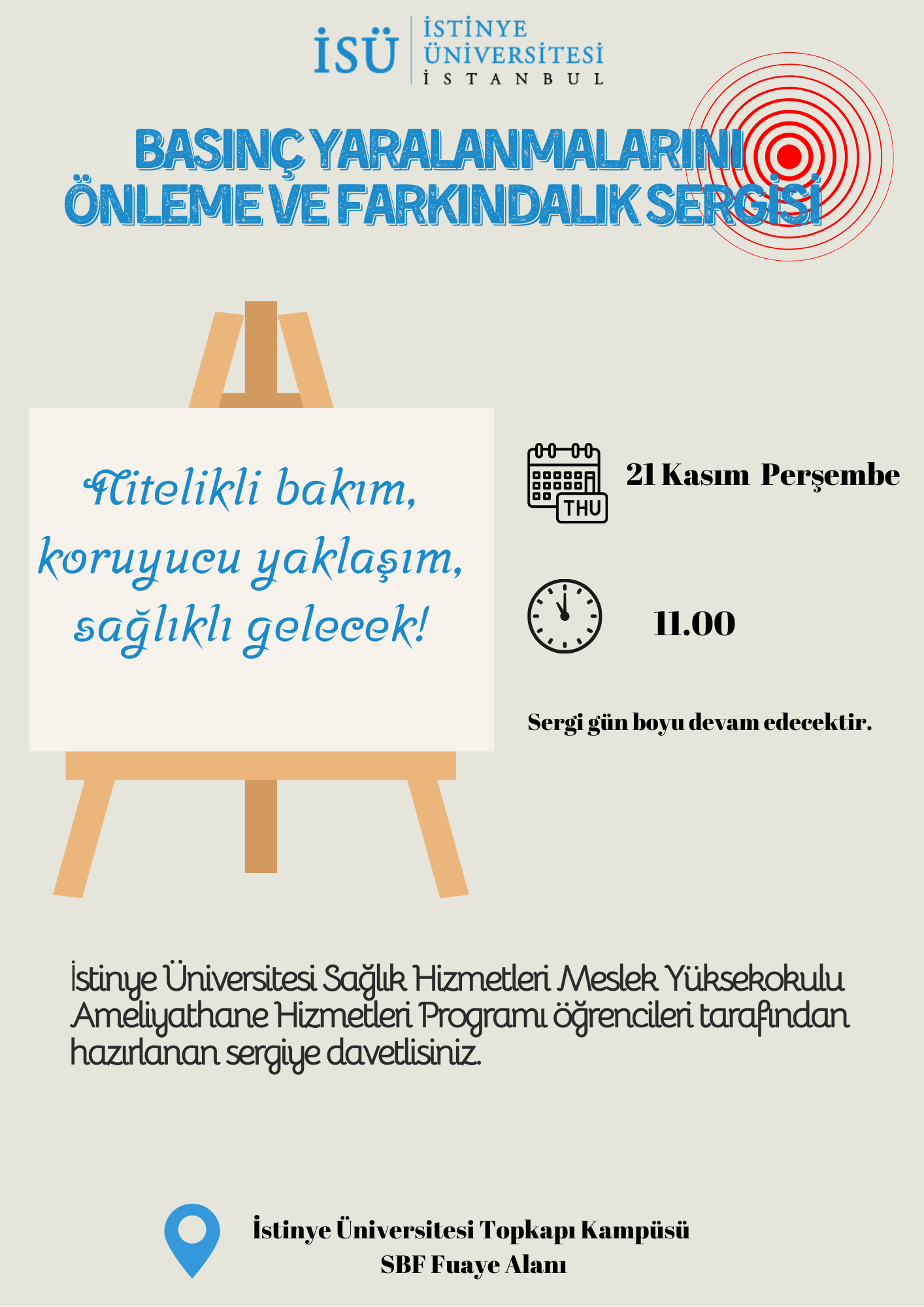 İstinye Üniversitesi Ameliyathane Hizmetleri Bölümü öğrencileri tarafından 21 Kasım 2024 tarihinde Topkapı Kampüsü SBF Fuaye Alanı'nda gerçekleştirilecek olan Basınç Yaralanmalarını Önleme ve Farkındalık Sergisi etkinliğine davetlisiniz.