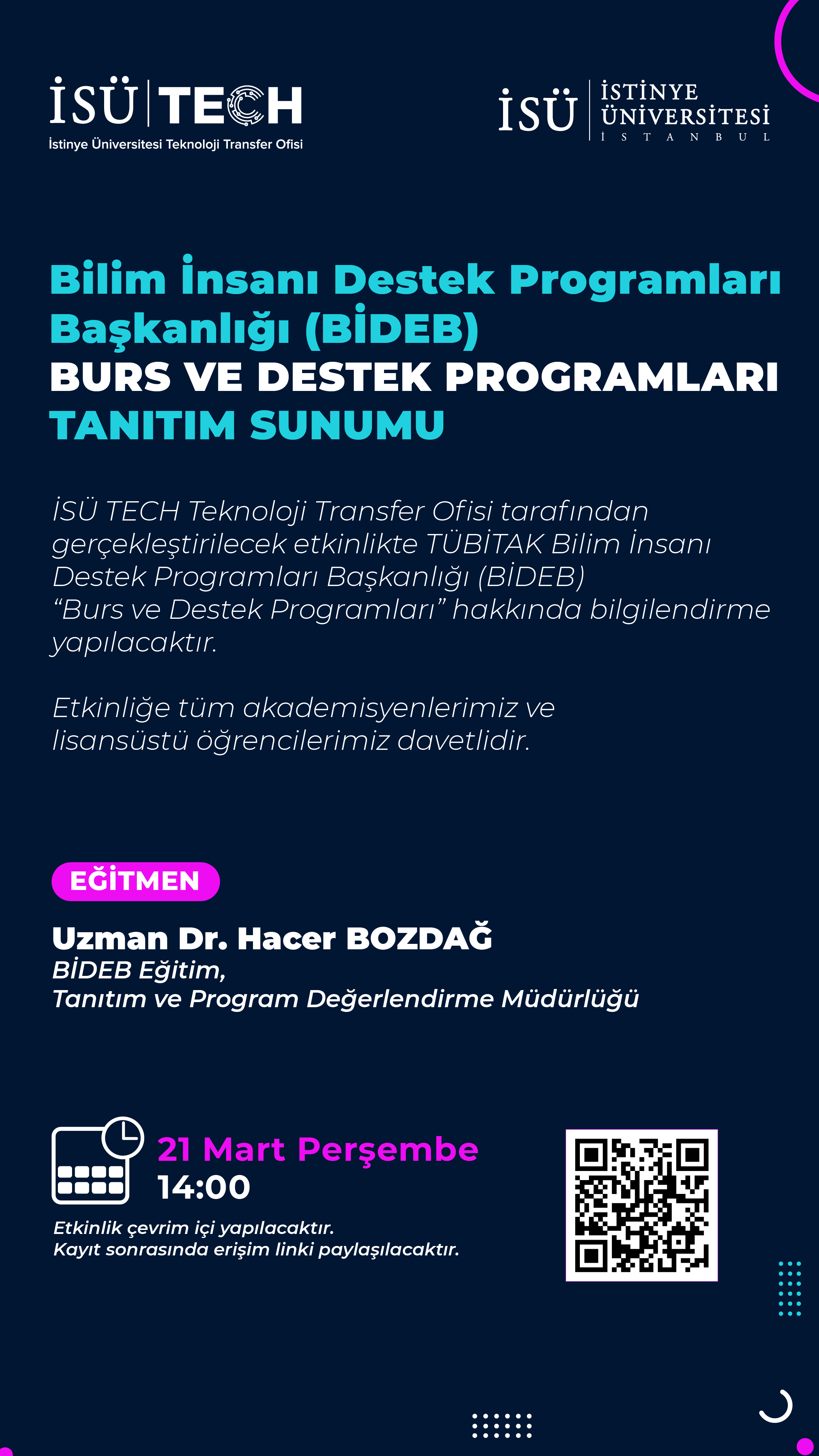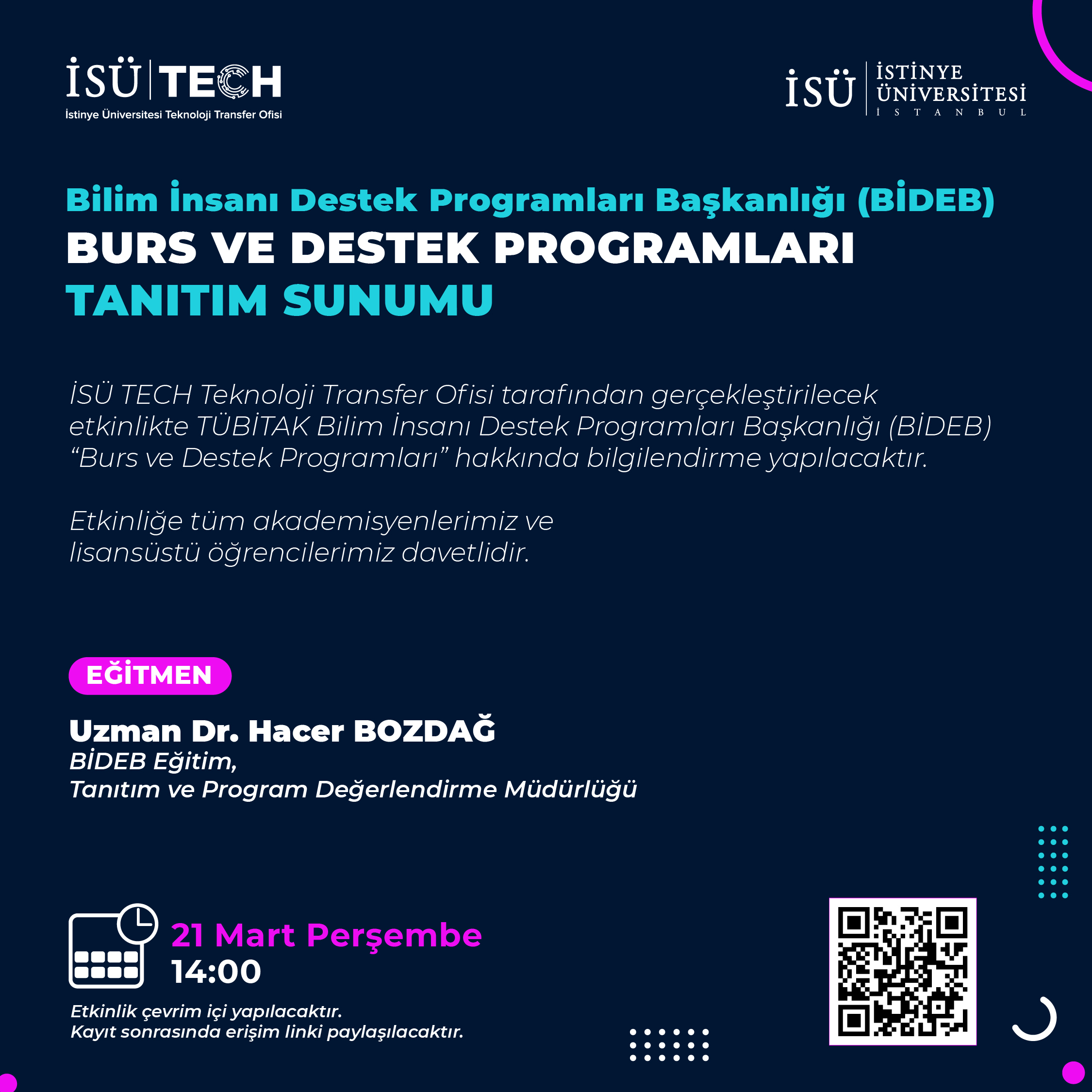 İSÜ TECH Teknoloji Transfer Ofisi tarafından 21 Mart 2024, Perşembe günü, 14.00-15.00 saatleri arasında “TÜBİTAK – Bilim İnsanı Destek Programları Başkanlığı (BİDEB)- Burs ve Destek Programları Tanıtım Sunumu” etkinliği gerçekleştirilecektir.
