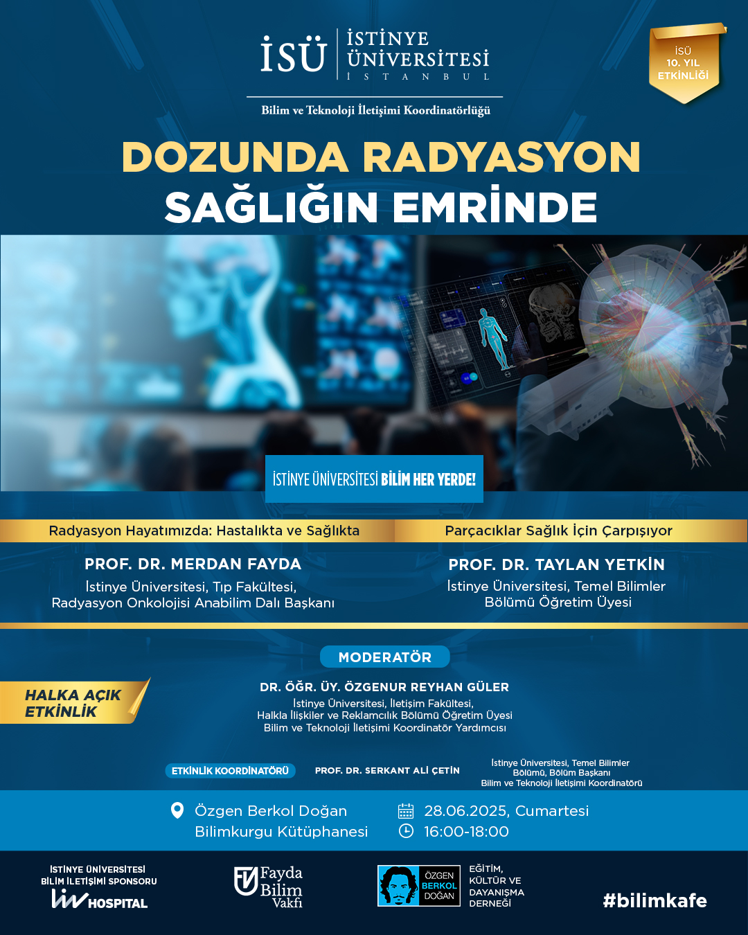 İstinye Üniversitesi, Bilim ve Teknoloji İletişim Koordinatörlüğü tarafından 28 Haziran 2025 tarihinde Bilim Kafe etkinlikleri kapsamında Dozunda Radyasyon Sağlığın Emrinde etkinliği gerçekleştirilecektir.