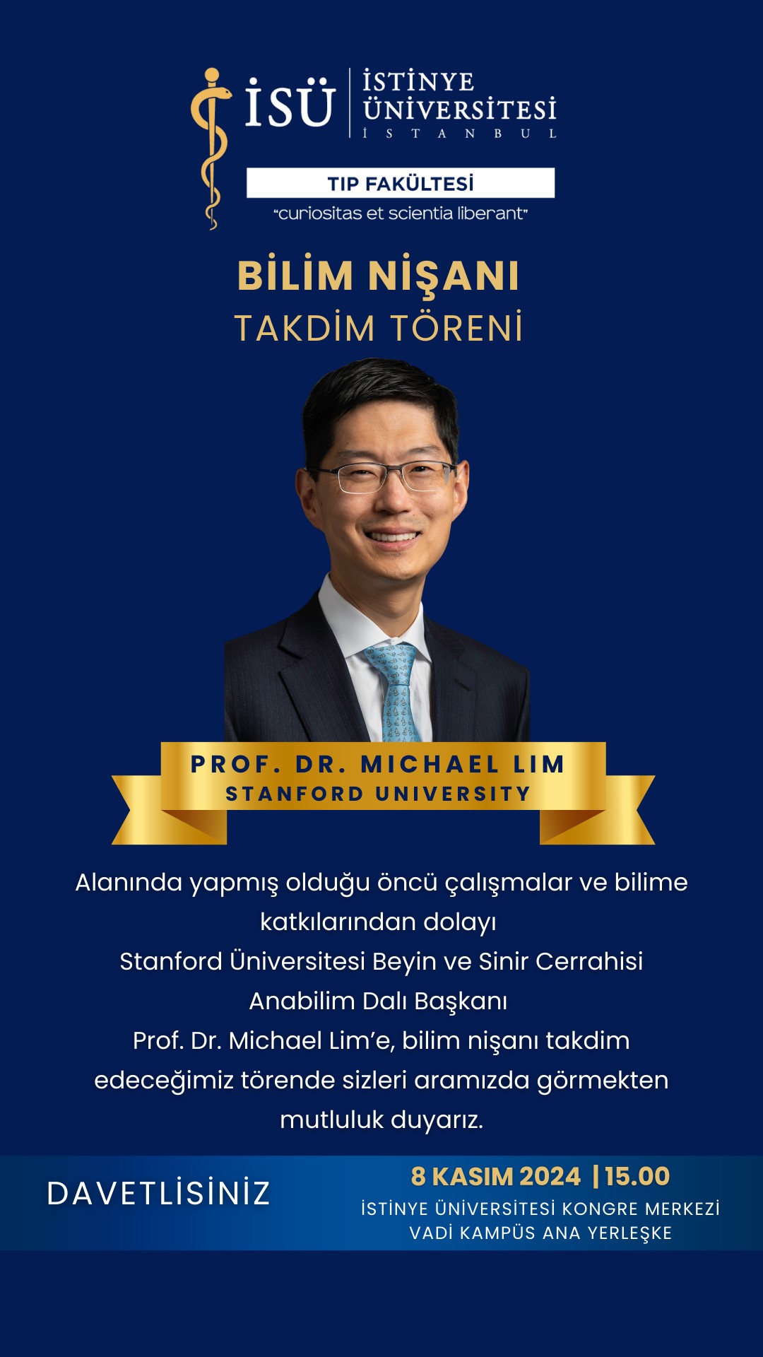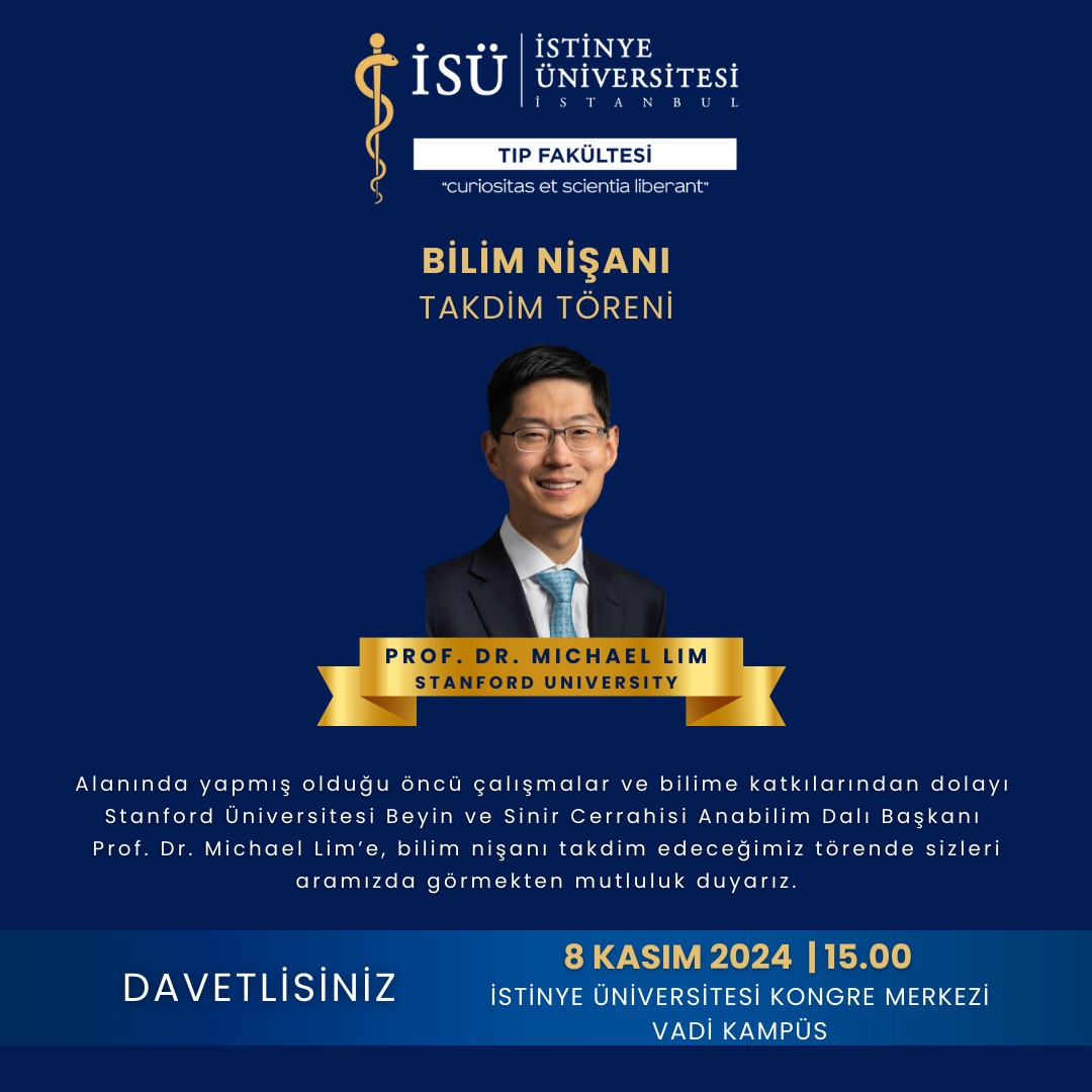 Alanında yapmış olduğu öncü çalışmalar ve bilime katkılarından dolayı Stanford Üniversitesi Beyin ve Sinir Cerrahisi Anabilim Dalı Başkanı Prof. Dr. Michael Lim'e, bilim nişanı takdim edeceğimiz törende sizleri aramızda görmekten mutluluk duyarız.