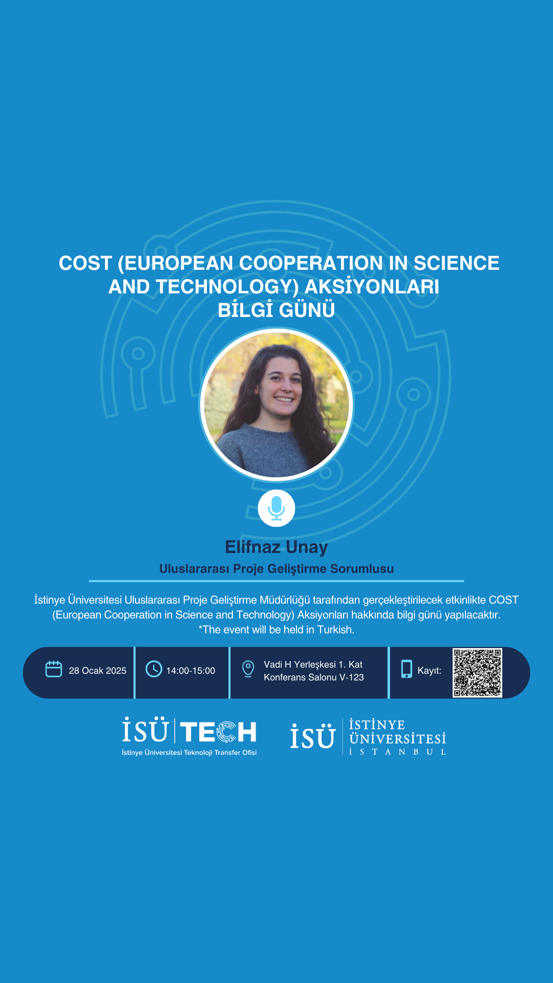 İstinye Üniversitesi Uluslararası Proje Geliştirme Müdürlüğü tarafından 28 Ocak 2025, Salı günü saat 14.00'te Vadi H Yerleşke Konferans Salonu'nda gerçekleştirilecek olan "COST Aksiyonları Bilgi Günü" isimli etkinliğe davetlisiniz.