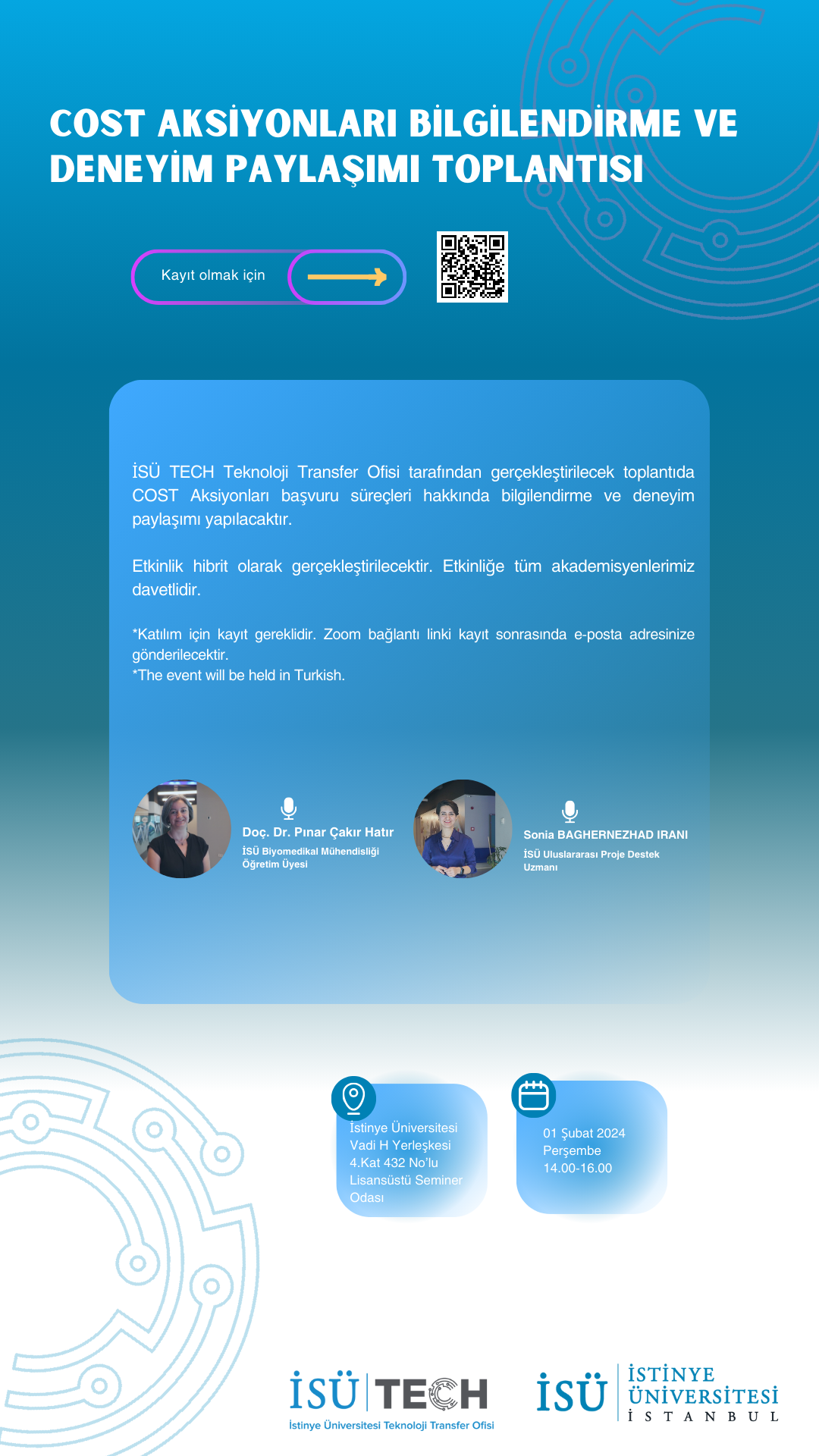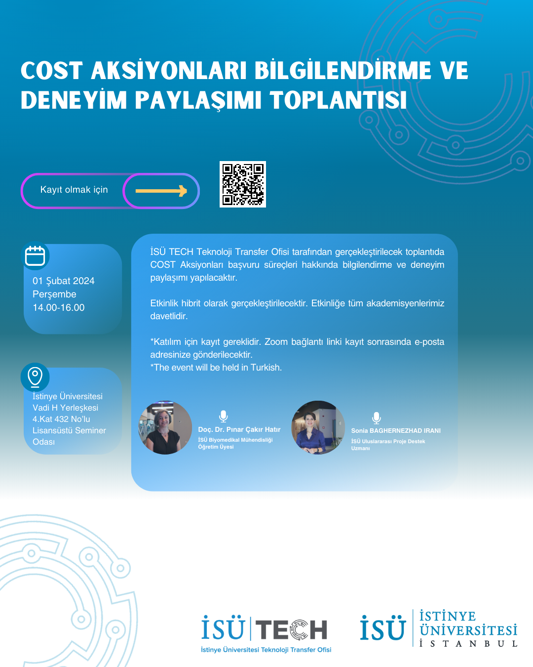 İSÜ TECH Teknoloji Transfer Ofisi tarafından 01 Şubat 2024, Perşembe günü, 14.00-16.00 saatleri arasında “COST Aksiyonları Bilgilendirme ve Deneyim Paylaşımı Toplantısı” gerçekleştirilecektir.