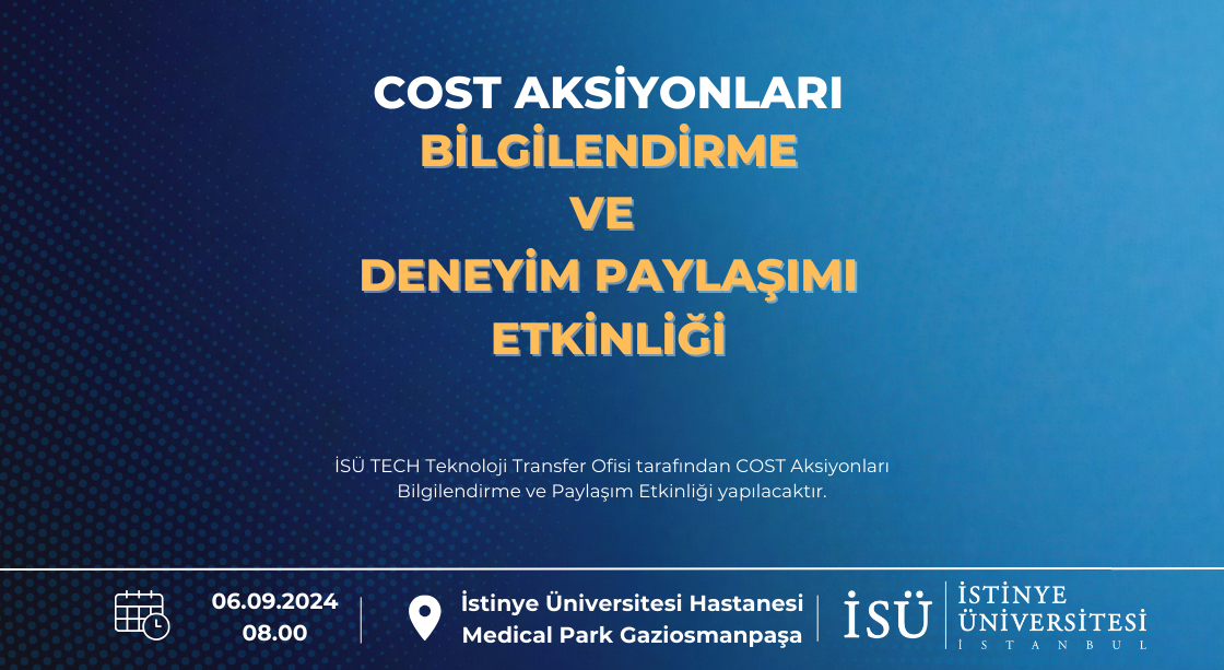 İSÜ TECH Teknoloji Transfer Ofisi tarafından 6 Eylül 2024 tarihinde saat 08.00'de COST Aksiyonları Bilgilendirme ve Paylaşım Etkinliği yapılacaktır.