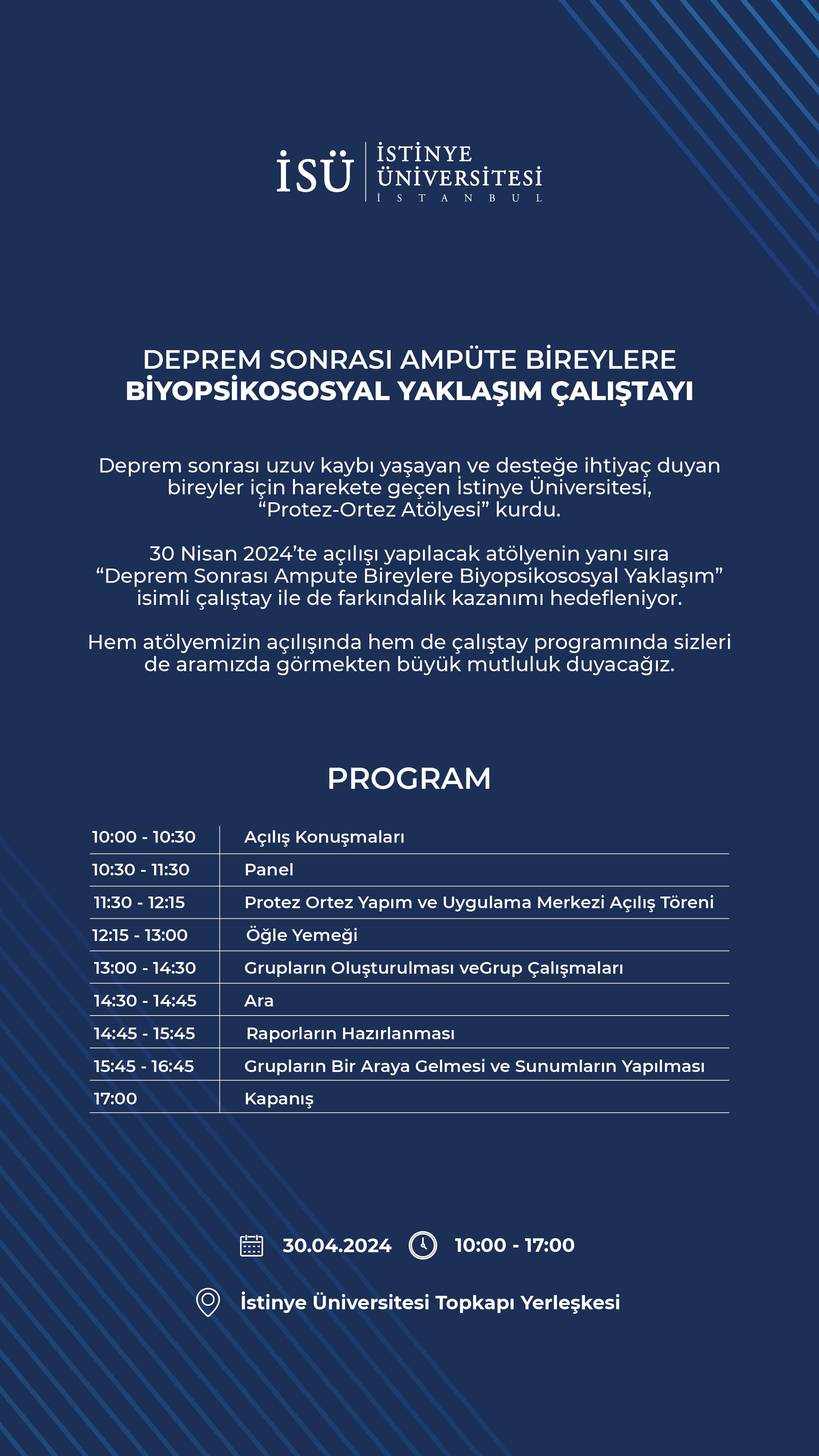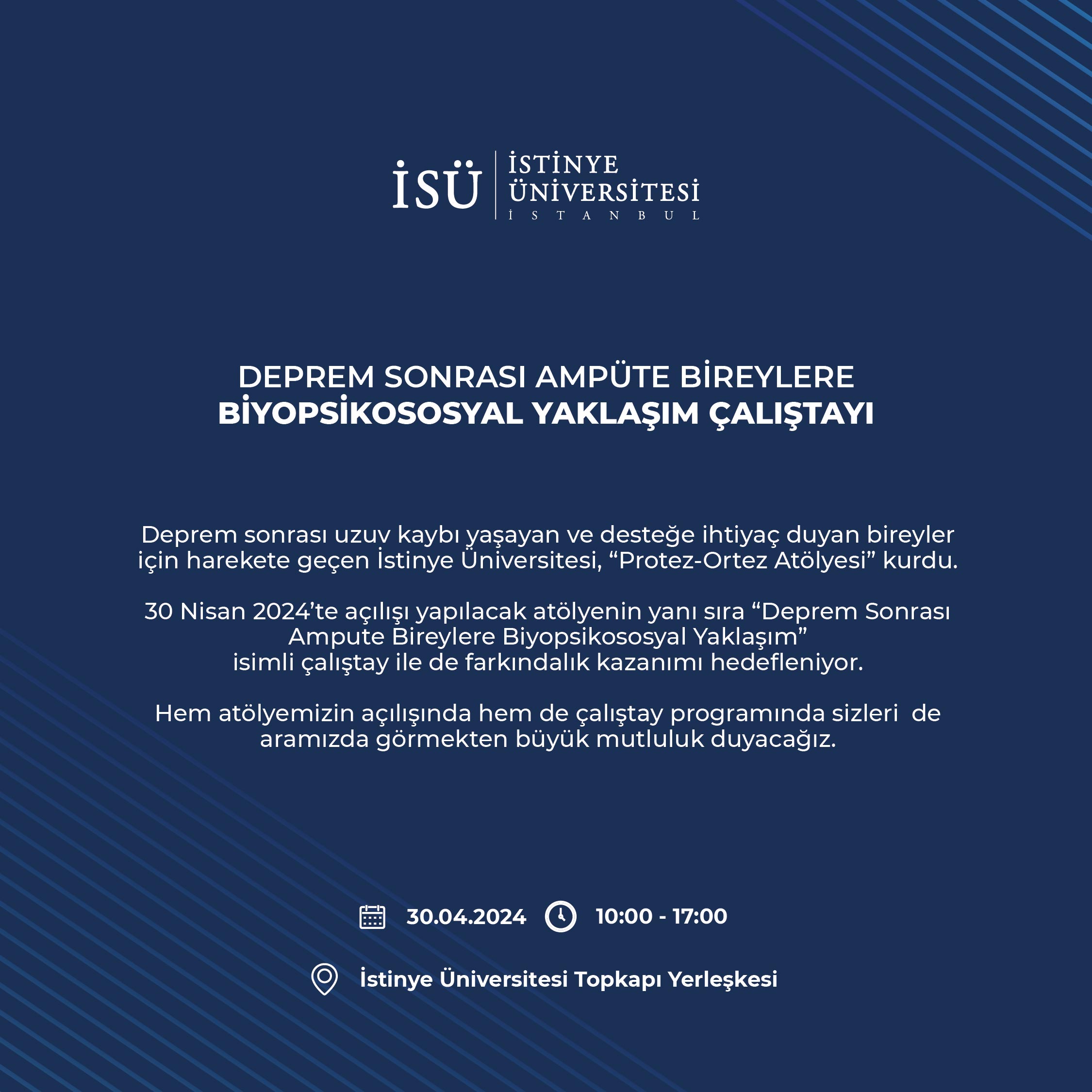 30 Nisan 2024'te açılışı yapılacak atölyenin yanı sıra "Deprem Sonrası Ampute Bireylere Biyopsikososyal Yaklaşım" isimli çalıştay ile de farkındalık kazanımı hedefleniyor.