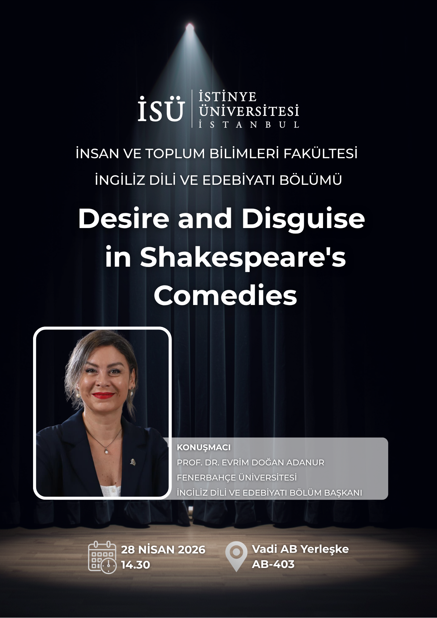 İstinye Üniversitesi, İngiliz Dili ve Edebiyatı Bölümü tarafından 28 Nisan 2026, saat 14.30'da gerçekleşecek olan “Desire and Disguise in Shakespeare's Comedies” isimli etkinliğe davetlisiniz.