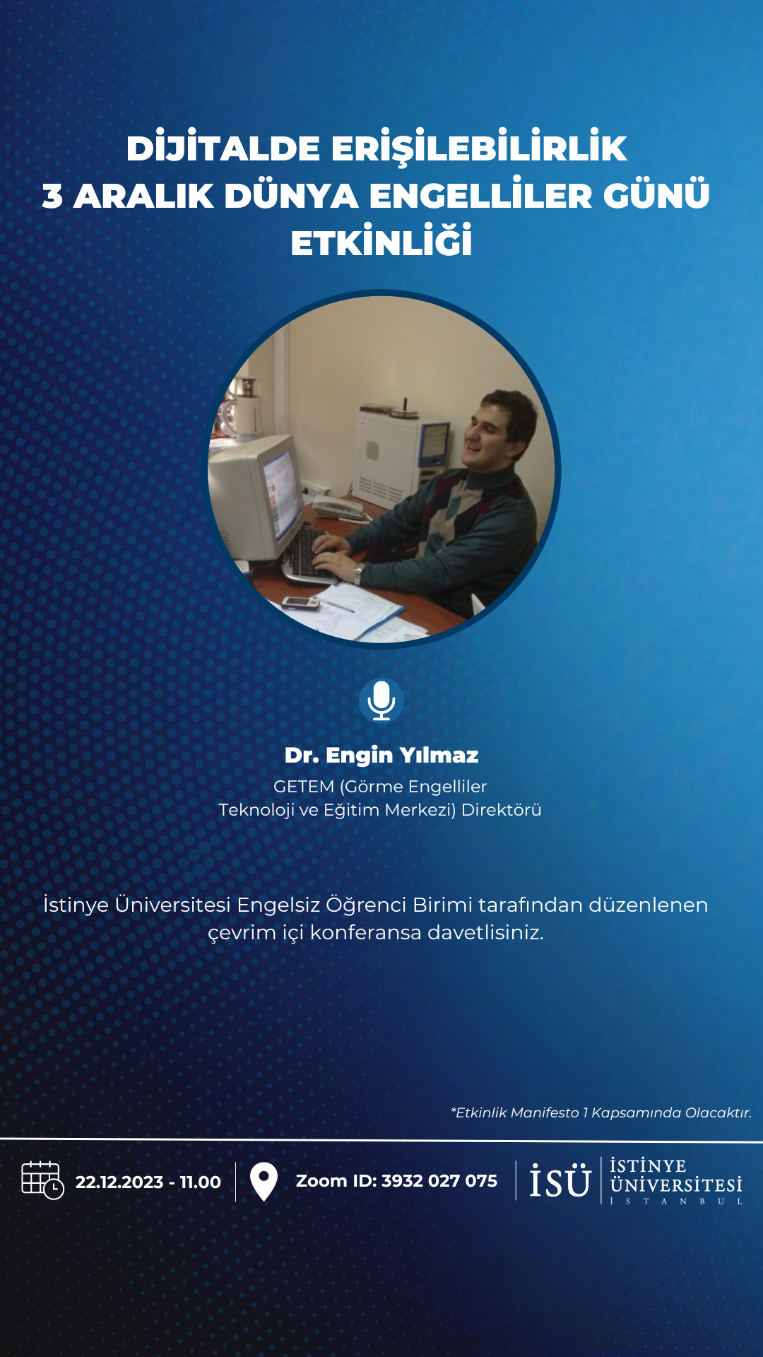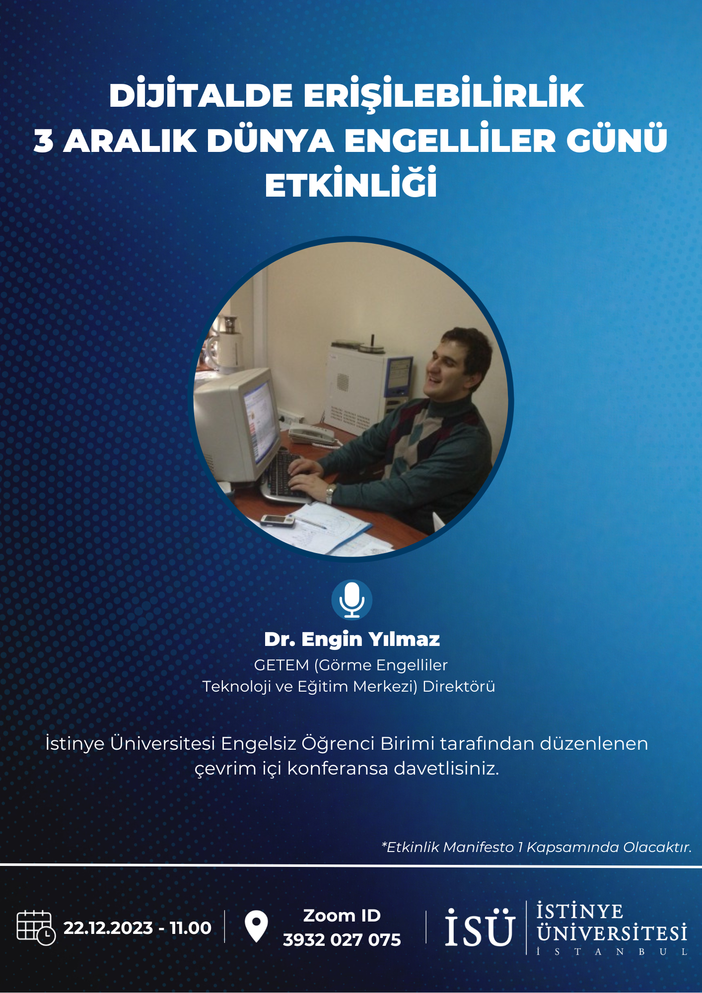 İstinye Üniversitesi Engelsiz Öğrenci Birimi tarafından 22 Aralık 2023 Cuma günü saat 11:00'de çevrim içi gerçekleştirilecek seminere davetlisiniz.
