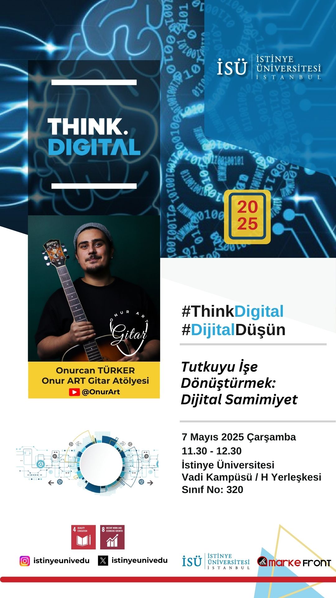 İstinye Üniversitesi Siyaset Bilimi ve Kamu Yönetimi Bölüm Başkanlığı tarafından 07 Mayıs 2025 Çarşamba günü, saat 11.30'da Vadi H Yerleşkesi V-320 numaralı derslikte gerçekleştirilecek olan "#DijitalDüşün: Tutkuyu İşe Dönüştürmek: Dijital Samimiyet" etkinliğine davetlisiniz.