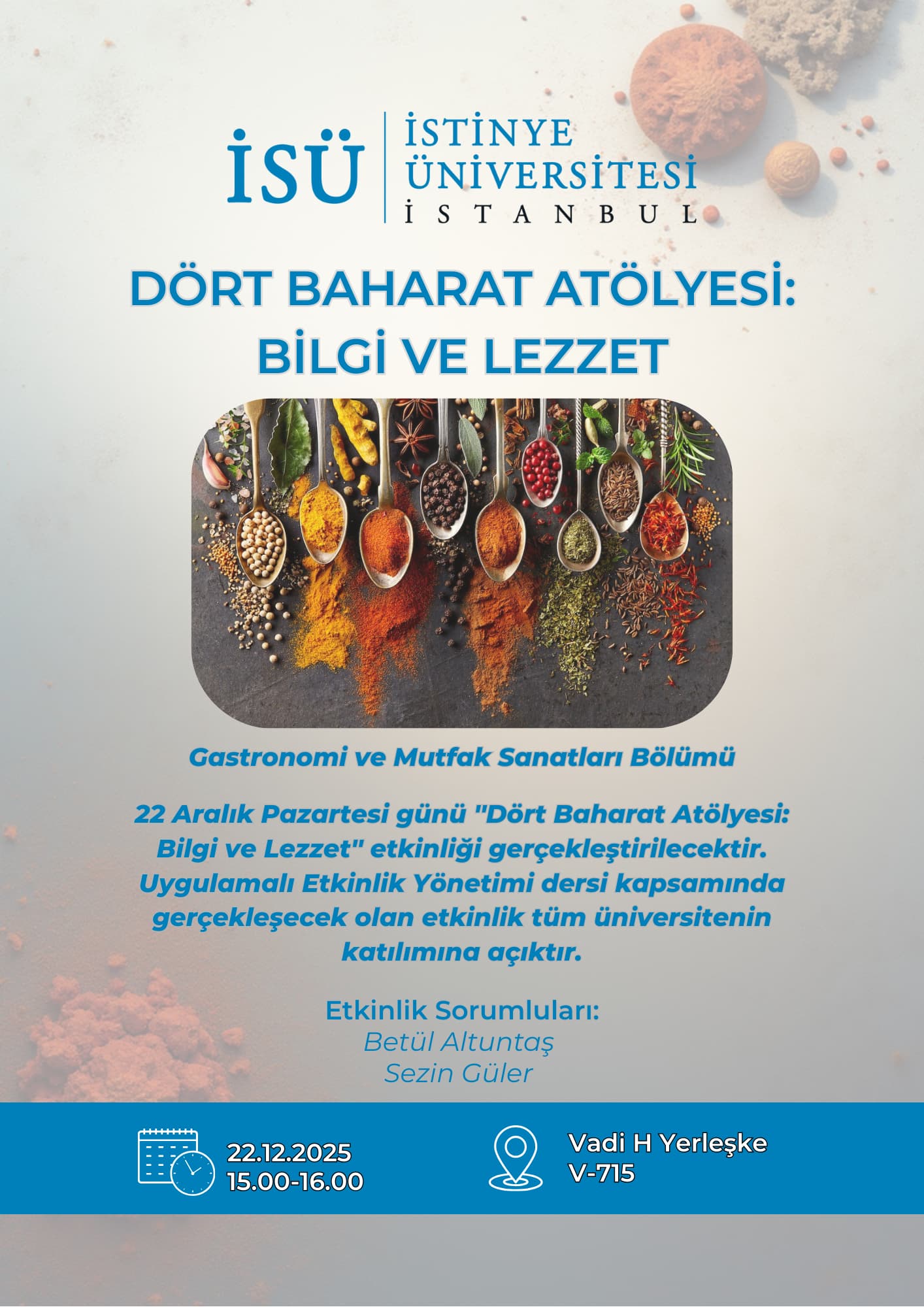 İstinye Üniversitesi, Gastronomi ve Mutfak Sanatları Bölümü tarafından 16 Aralık 2025, saat 14.00'da gerçekleşecek olan “Dört Baharat Atölyesi: Bilgi ve Lezzet” isimli etkinliğe davetlisiniz.