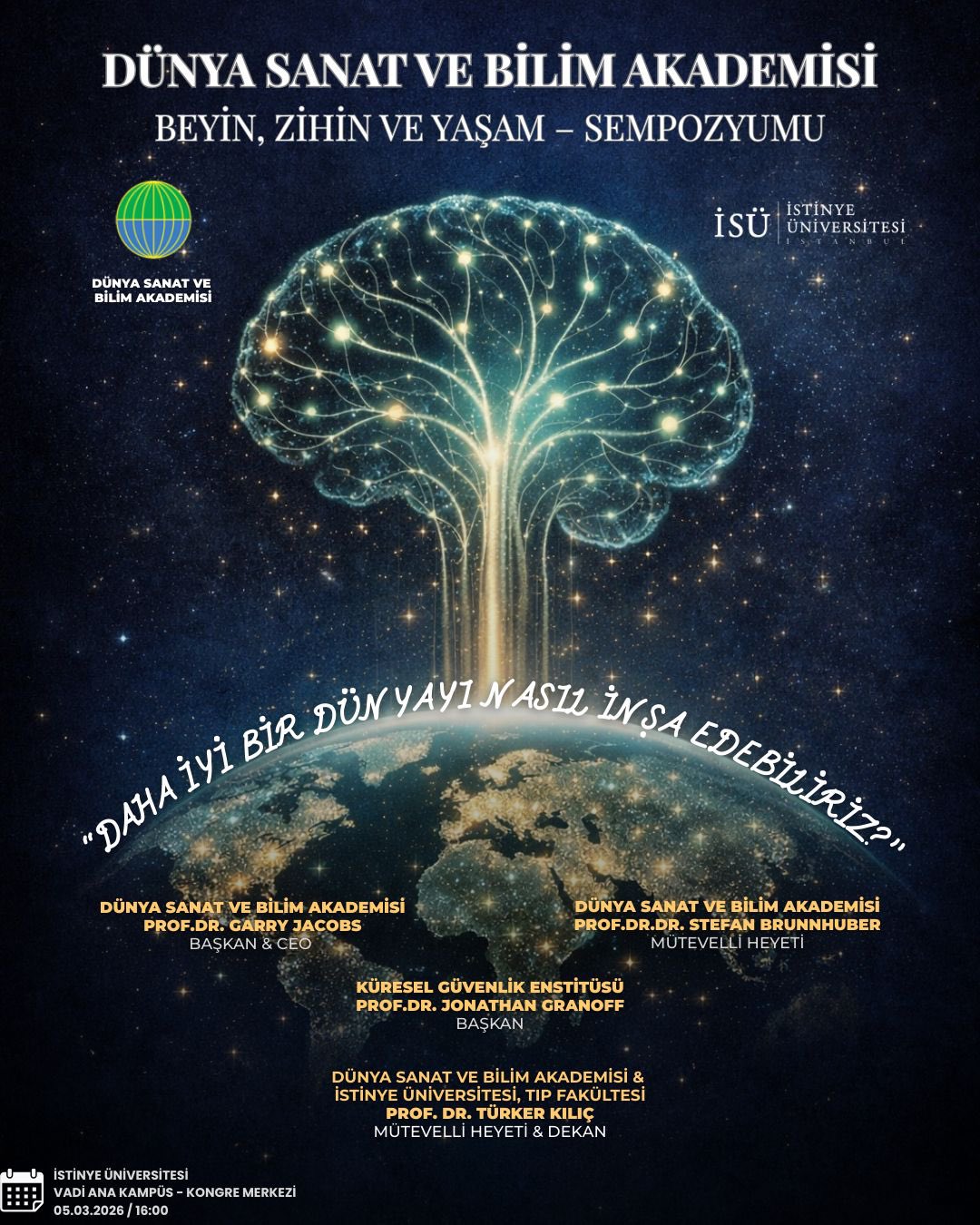 Dünya Sanat ve Bilim Akademisi çatısı altında düzenlenen Beyin, Zihin ve Yaşam Sempozyumu "Daha İyi Bir Dünyayı Nasıl İnşa Edebiliriz?" teması ile Tıp Fakültesi Dekanlığı tarafından Bilim ve Teknoloji İletişimi Koordinatörlüğü desteği ile düzenlenmekte olan etkinliğe davetlisiniz.