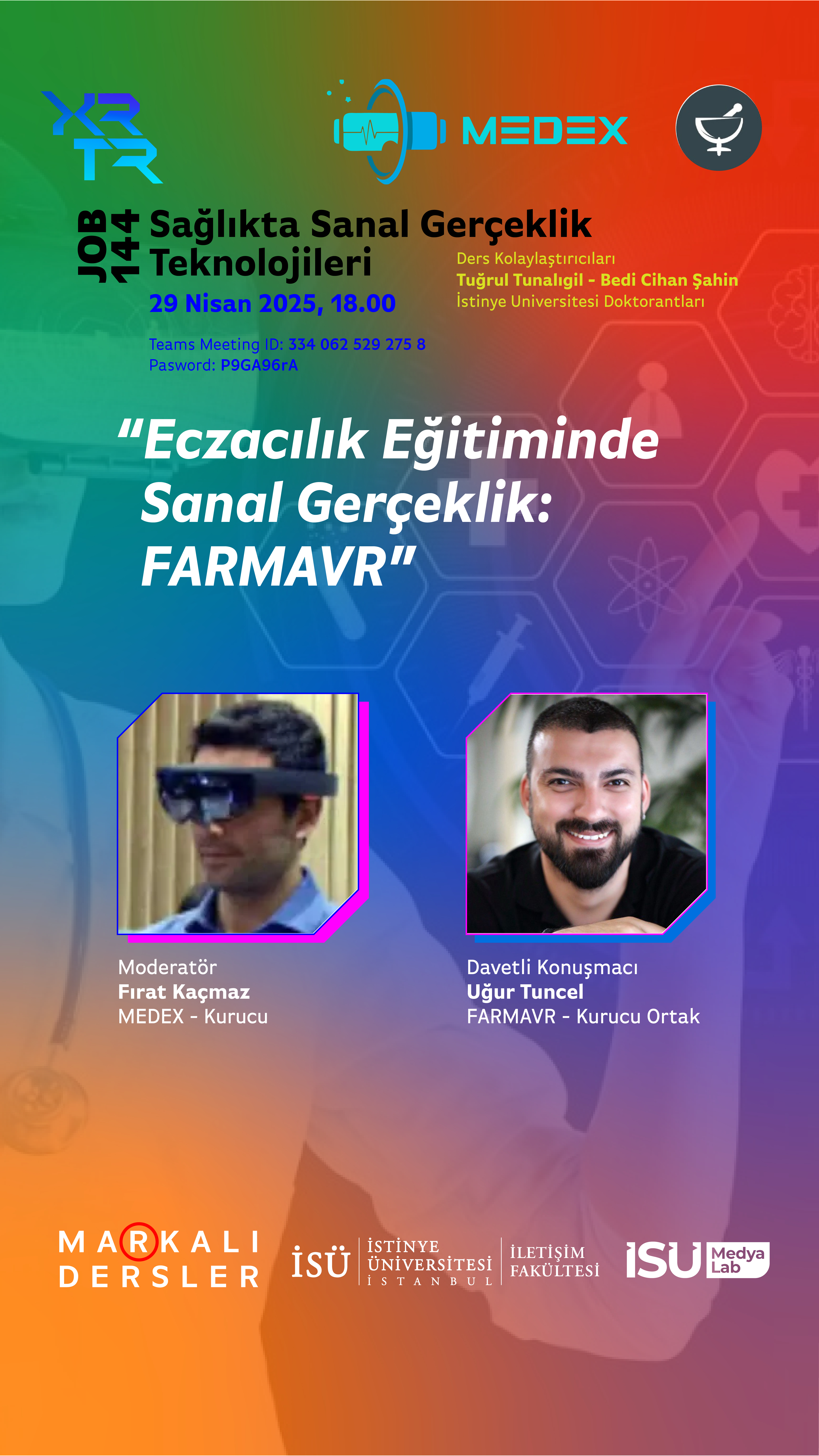 İstinye Üniversitesi İletişim Fakültesi tarafından XR Türkiye ve Medex Lab işbirliğinde JOB 144 Sağlıkta Sanal Gerçeklik Teknolojileri markalı dersi kapsamında 29 Nisan 2025 Salı günü, saat 18.00'da Medex Kurucusu Fırat Kaçmaz Moderasyonunda, FARMAVR Kurucusu Uğur Tuncel ile gerçekleştirilecek söyleşiye davetlisiniz.